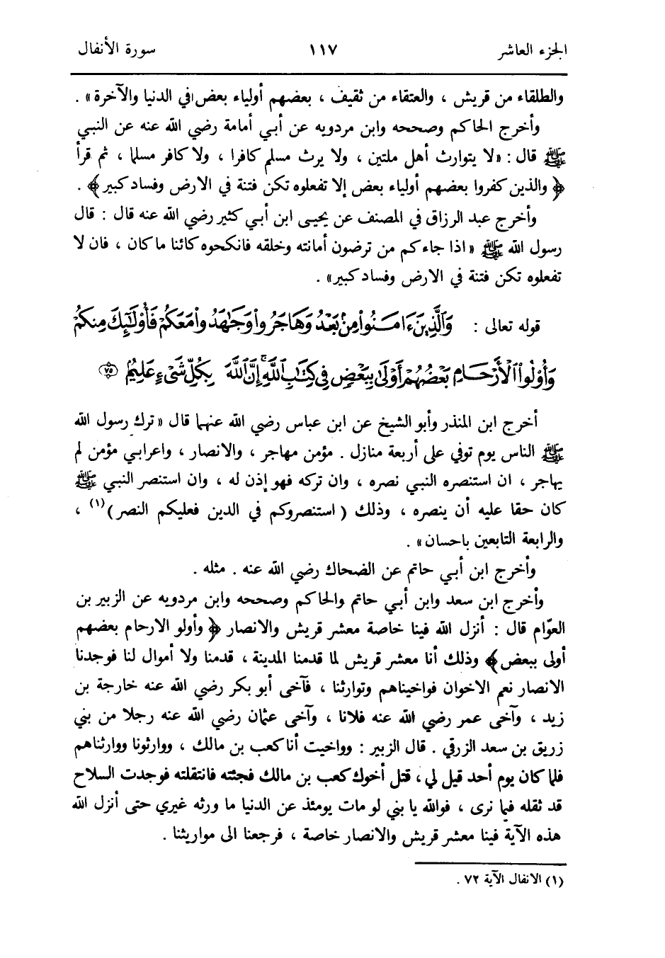 وَأخرج ابْن سعد وَابْن أبي حَاتِم وَالْحَاكِم وَصَححهُ وَابْن مرْدَوَيْه عَن الزبير بن الْعَوام قَالَ: أنزل الله فِينَا خَاصَّة معشر قُرَيْش وَالْأَنْصَار {وأولو الْأَرْحَام بَعضهم أولى بِبَعْض} وَذَلِكَ أَنا معشر قُرَيْش لما قدمنَا الْمَدِينَة قدمنَا وَلَا أَمْوَال لنا فَوَجَدنَا الْأَنْصَار نعم الإِخوان فواخيناهم وتوارثنا فآخى أَبُو بكر رَضِي الله عَنهُ خَارِجَة بن زيد وآخى عمر رَضِي الله عَنهُ فلَانا وآخى عُثْمَان رَضِي الله عَنهُ رجلا من بني زُرَيْق بن سعد الزرقي