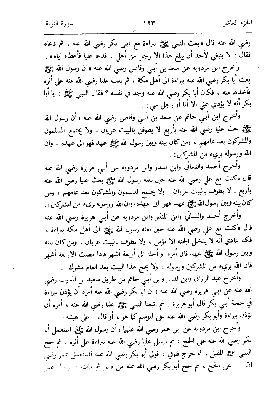 وَأخرج ابْن أبي حَاتِم عَن سعد بن أبي وَقاص رَضِي الله عَنهُ أَن رَسُول الله صلى الله عَلَيْهِ وَسلم بعث عليا رَضِي الله عَنهُ بِأَرْبَع لَا يَطُوفَن بِالْبَيْتِ عُرْيَان وَلَا يجْتَمع الْمُسلمُونَ وَالْمُشْرِكُونَ بعد عَامهمْ وَمن كَانَ بَينه وَبَين رَسُول الله صلى الله عَلَيْهِ وَسلم عهد فَهُوَ إِلَى عَهده وَإِن الله وَرَسُوله بَرِيء من الْمُشْركين