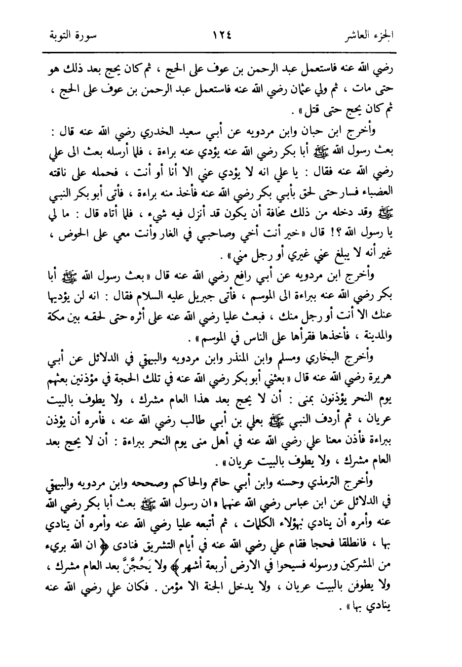 وَأخرج البُخَارِيّ وَمُسلم وَابْن الْمُنْذر وَابْن مرْدَوَيْه وَالْبَيْهَقِيّ فِي الدَّلَائِل عَن أبي هُرَيْرَة رَضِي الله عَنهُ قَالَ بَعَثَنِي أَبُو بكر رَضِي الله عَنهُ فِي تِلْكَ الْحجَّة فِي مؤذنين بَعثهمْ يَوْم النَّحْر يُؤذنُونَ بمنى: أَن لَا يحجّ بعد هَذَا الْعَام مُشْرك وَلَا يطوف بِالْبَيْتِ عُرْيَان ثمَّ أرْدف النَّبِي صلى الله عَلَيْهِ وَسلم بعلي بن أبي طَالب رَضِي الله عَنهُ فَأمره أَن يُؤذن بِبَرَاءَة فَأذن مَعنا عَليّ رَضِي الله عَنهُ فِي أهل منى يَوْم النَّحْر بِبَرَاءَة: أَن لَا يحجّ بعد الْعَام مُشْرك وَلَا يطوف بِالْبَيْتِ عُرْيَان