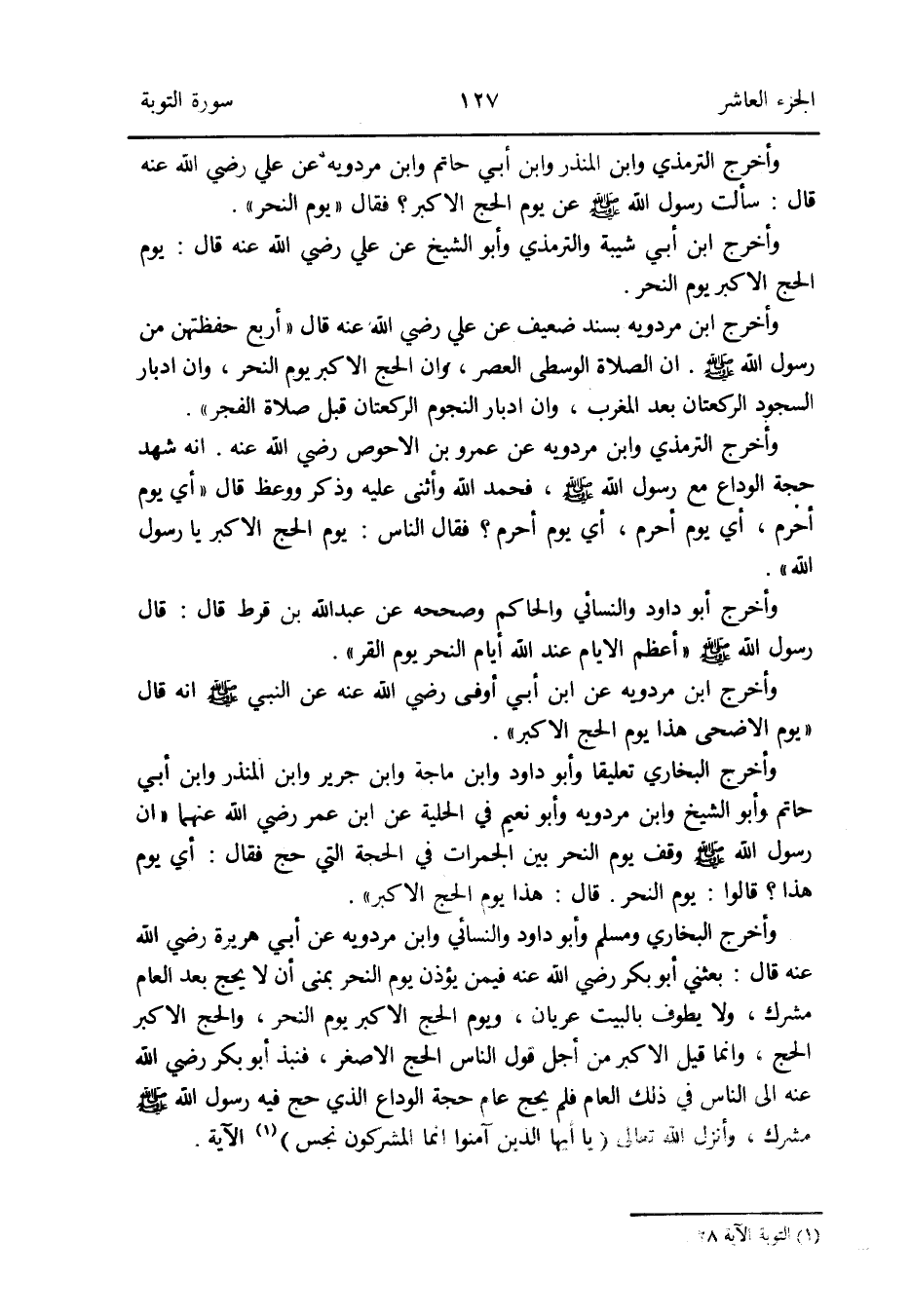 وَأخرج البُخَارِيّ وَمُسلم وَأَبُو دَاوُد وَالنَّسَائِيّ وَابْن مرْدَوَيْه عَن أبي هُرَيْرَة رَضِي الله عَنهُ قَالَ: بَعَثَنِي أَبُو بكر رَضِي الله عَنهُ فِيمَن يُؤذن يَوْم النَّحْر بمنى أَن لَا يحجّ بعد الْعَام مُشْرك وَلَا يطوف بِالْبَيْتِ عُرْيَان وَيَوْم الْحَج الْأَكْبَر يَوْم النَّحْر وَالْحج الْأَكْبَر الْحَج وَإِنَّمَا قيل الْأَكْبَر من أجل قَول النَّاس الْحَج الْأَصْغَر فنبذ أَبُو بكر رَضِي الله عَنهُ إِلَى النَّاس فِي ذَلِك الْعَام فَلم يحجّ عَام حجَّة الْوَدَاع الَّذِي حج فِيهِ رَسُول الله صلى الله عَلَيْهِ وَسلم مُشْرك وَأنزل الله تَعَالَى (يَا أَيهَا الَّذين آمنُوا إِنَّمَا الْمُشْركُونَ نجس) (التَّوْبَة الْآيَة 28) الْآيَة