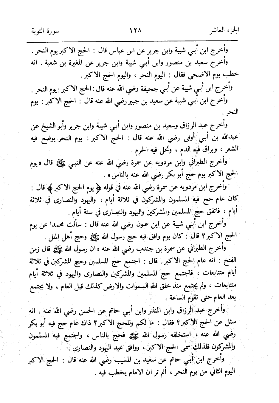 وَأخرج ابْن أبي شيبَة وَابْن جرير عَن ابْن عَبَّاس قَالَ: الْحَج الْأَكْبَر يَوْم النَّحْر