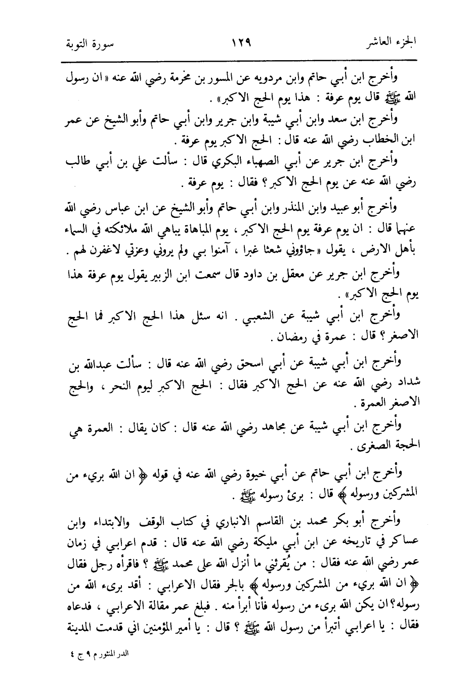 وَأخرج ابْن جرير عَن أبي الصَّهْبَاء الْبكْرِيّ قَالَ: سَأَلت عَليّ بن أبي طَالب رَضِي الله عَنهُ عَن يَوْم الْحَج الْأَكْبَر فَقَالَ: يَوْم عَرَفَة