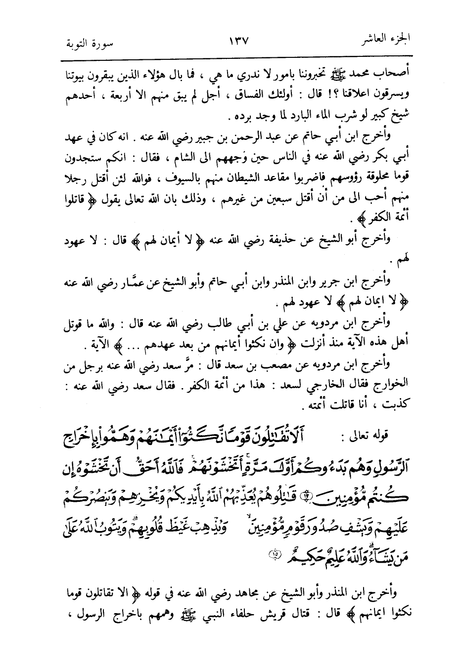 وَأخرج ابْن الْمُنْذر وَأَبُو الشَّيْخ عَن مُجَاهِد رَضِي الله عَنهُ فِي قَوْله {أَلا تقاتلون قوما نكثوا أَيْمَانهم} قَالَ: قتال قُرَيْش حلفاء النَّبِي صلى الله عَلَيْهِ وَسلم وهمهم باخراج الرَّسُول