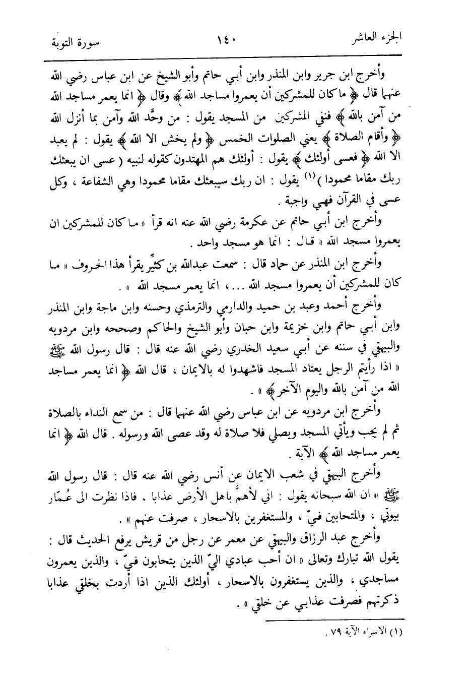 وَأخرج ابْن جرير وَابْن الْمُنْذر وَابْن أبي حَاتِم وَأَبُو الشَّيْخ عَن ابْن عَبَّاس رَضِي الله عَنْهُمَا قَالَ {مَا كَانَ للْمُشْرِكين أَن يعمروا مَسَاجِد الله} وَقَالَ {إِنَّمَا يعمر مَسَاجِد الله من آمن بِاللَّه} فنفي الْمُشْركين من الْمَسْجِد يَقُول: من وحَّد الله وآمن بِمَا أنزل الله {وَأقَام الصَّلَاة} يَعْنِي الصَّلَوَات الْخمس {وَلم يخْش إِلَّا الله} يَقُول: لم يعبد إِلَّا الله {فَعَسَى أُولَئِكَ} يَقُول: أُولَئِكَ هم المهتدون كَقَوْلِه لنَبيه (عَسى أَن يَبْعَثك رَبك مقَاما مَحْمُودًا) (الْإِسْرَاء الْآيَة 79) يَقُول: إِن رَبك سيبعثك مقَاما مَحْمُودًا وَهِي الشَّفَاعَة وكل عَسى فِي الْقُرْآن فَهِيَ وَاجِبَة