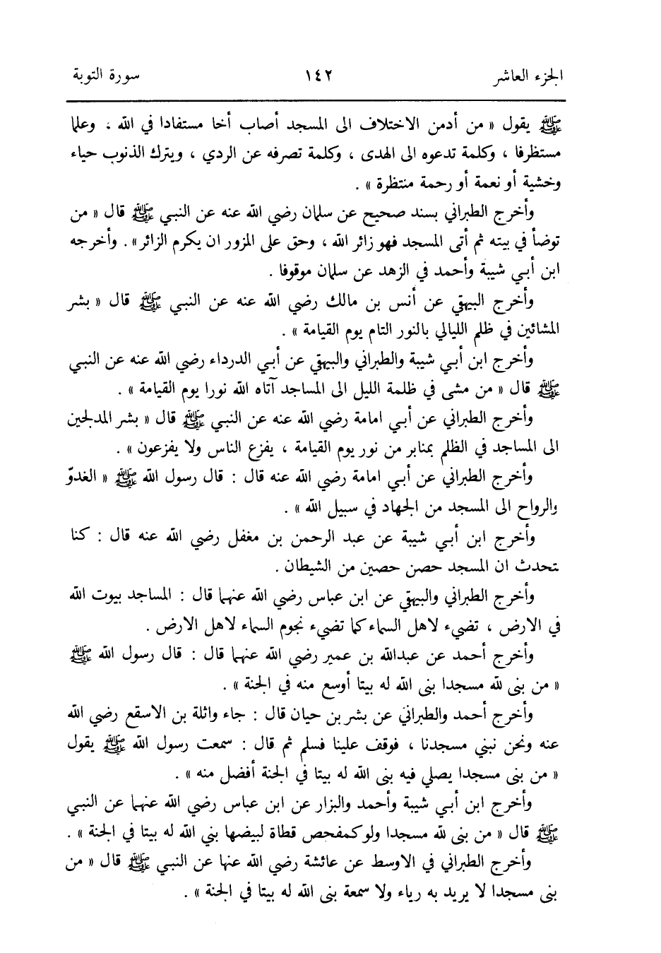 وَأخرج الطَّبَرَانِيّ وَالْبَيْهَقِيّ عَن ابْن عَبَّاس رَضِي الله عَنْهُمَا قَالَ: الْمَسَاجِد بيُوت الله فِي الأَرْض تضيء لأهل السَّمَاء كَمَا تضيء نُجُوم السَّمَاء لأهل الأَرْض
