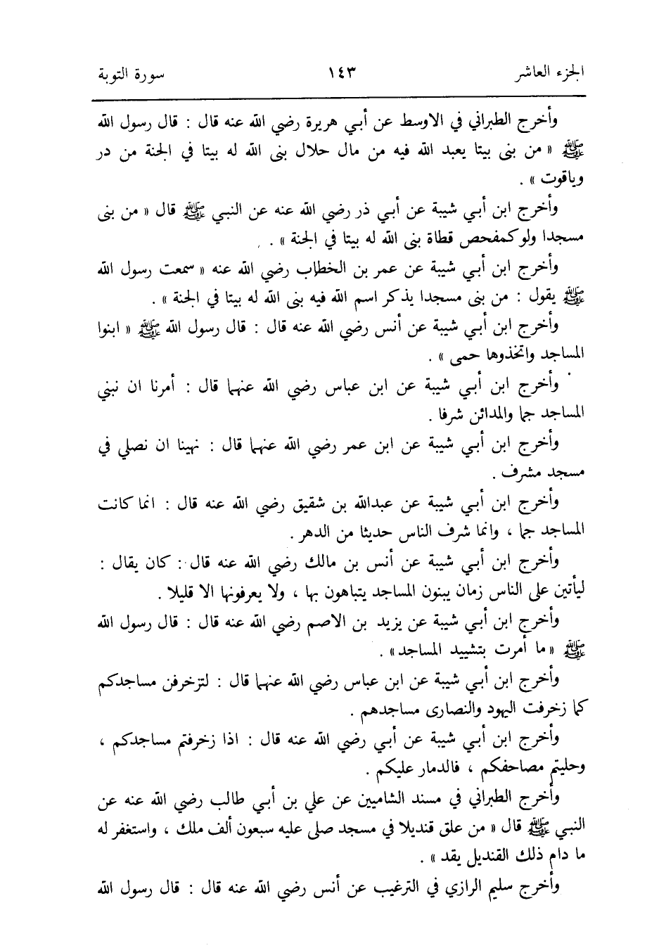 وَأخرج ابْن أبي شيبَة عَن ابْن عَبَّاس رَضِي الله عَنْهُمَا قَالَ: أمرنَا أَن نَبْنِي الْمَسَاجِد جماً والمدائن شرفاً
