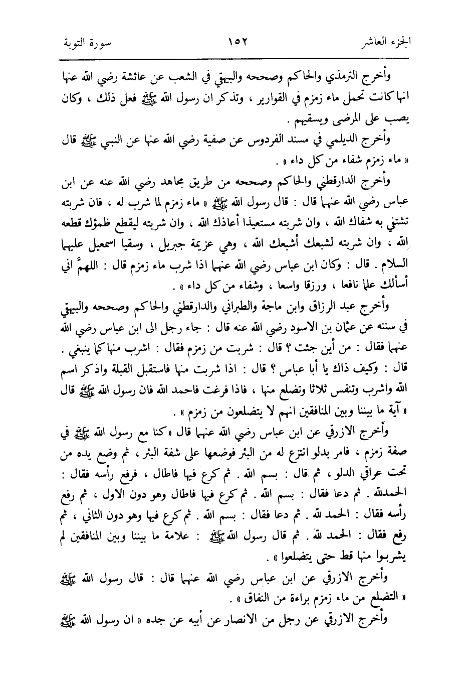 وَأخرج عبد الرَّزَّاق وَابْن ماجة وَالطَّبَرَانِيّ وَالدَّارَقُطْنِيّ وَالْحَاكِم وَصَححهُ وَالْبَيْهَقِيّ فِي سنَنه عَن عُثْمَان بن الْأسود رَضِي الله عَنهُ قَالَ: جَاءَ رجل إِلَى ابْن عَبَّاس رَضِي الله عَنْهُمَا فَقَالَ: من أَيْن جِئْت قَالَ: شربت من زَمْزَم فَقَالَ: اشرب مِنْهَا كَمَا يَنْبَغِي