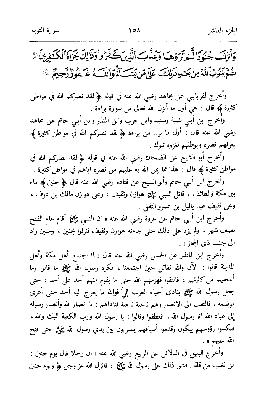 وَأخرج ابْن أبي شيبَة وسنيد وَابْن حَرْب وَابْن الْمُنْذر وَابْن أبي حَاتِم عَن مُجَاهِد رَضِي الله عَنهُ قَالَ: أول مَا نزل من بَرَاءَة {لقد نصركم الله فِي مَوَاطِن كَثِيرَة} يعرفهُمْ نَصره ويوطنهم لغزوة تَبُوك