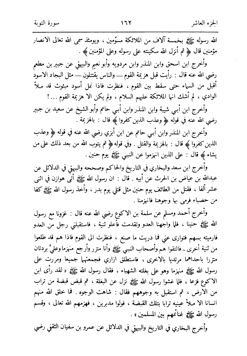 وَأخرج أَحْمد وَمُسلم عَن سَلمَة بن الْأَكْوَع رَضِي الله عَنهُ قَالَ: غزونا مَعَ رَسُول الله صلى الله عَلَيْهِ وَسلم حنيناً فَلَمَّا وَاجَهنَا الْعَدو وَتَقَدَّمت فأعلو ثنية فاستقبلني رجل من الْعَدو فأرميته بِسَهْم فتوارى عني فَمَا دَريت مَا صنع فَنَظَرت إِلَى الْقَوْم فَإِذا هم قد طلعوا من ثنية أُخْرَى فَالْتَقوا هم وَأَصْحَاب وَالنَّبِيّ صلى الله عَلَيْهِ وَسلم وَأَنا متزر وأرجع مُنْهَزِمًا وعليَّ بردتان متزراً بِأَحَدِهِمَا مرتدياً بِالْأُخْرَى فاستطلق إزَارِي فجمعتهما جَمِيعًا ومررت على رَسُول الله صلى الله عَلَيْهِ وَسلم مُنْهَزِمًا وَهُوَ على بغلته الشَّهْبَاء فَقَالَ رَسُول الله صلى الله عَلَيْهِ وَسلم لقد رأى ابْن الْأَكْوَع فَزعًا فَلَمَّا غشوا رَسُول الله صلى الله عَلَيْهِ وَسلم نزل عَن البغلة ثمَّ قبض قَبْضَة من تُرَاب من الأَرْض ثمَّ اسْتقْبل بِهِ وُجُوههم فَقَالَ: شَاهَت الْوُجُوه