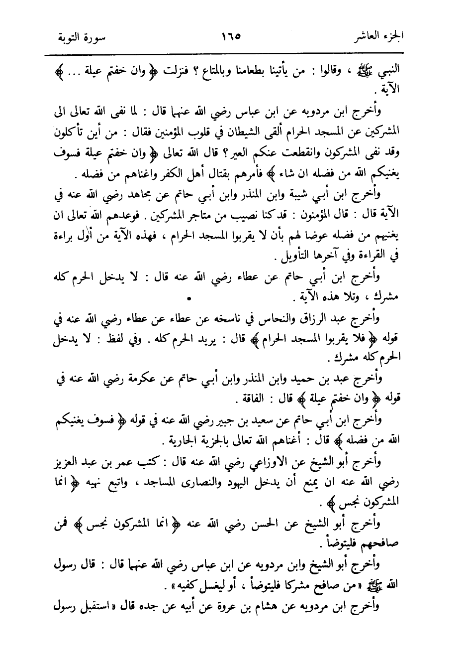 وَأخرج ابْن مردوية عَن ابْن عَبَّاس رَضِي الله عَنْهُمَا قَالَ: لما نفى الله تَعَالَى إِلَى الْمُشْركين عَن الْمَسْجِد الْحَرَام ألْقى الشَّيْطَان فِي قُلُوب الْمُؤمنِينَ فَقَالَ: من أَيْن تَأْكُلُونَ وَقد نفى الْمُشْركُونَ وانقطعت عَنْكُم العير قَالَ الله تَعَالَى {وَإِن خِفْتُمْ عيلة فَسَوف يغنيكم الله من فَضله إِن شَاءَ} فَأَمرهمْ بِقِتَال أهل الْكفْر وأغناهم من فَضله