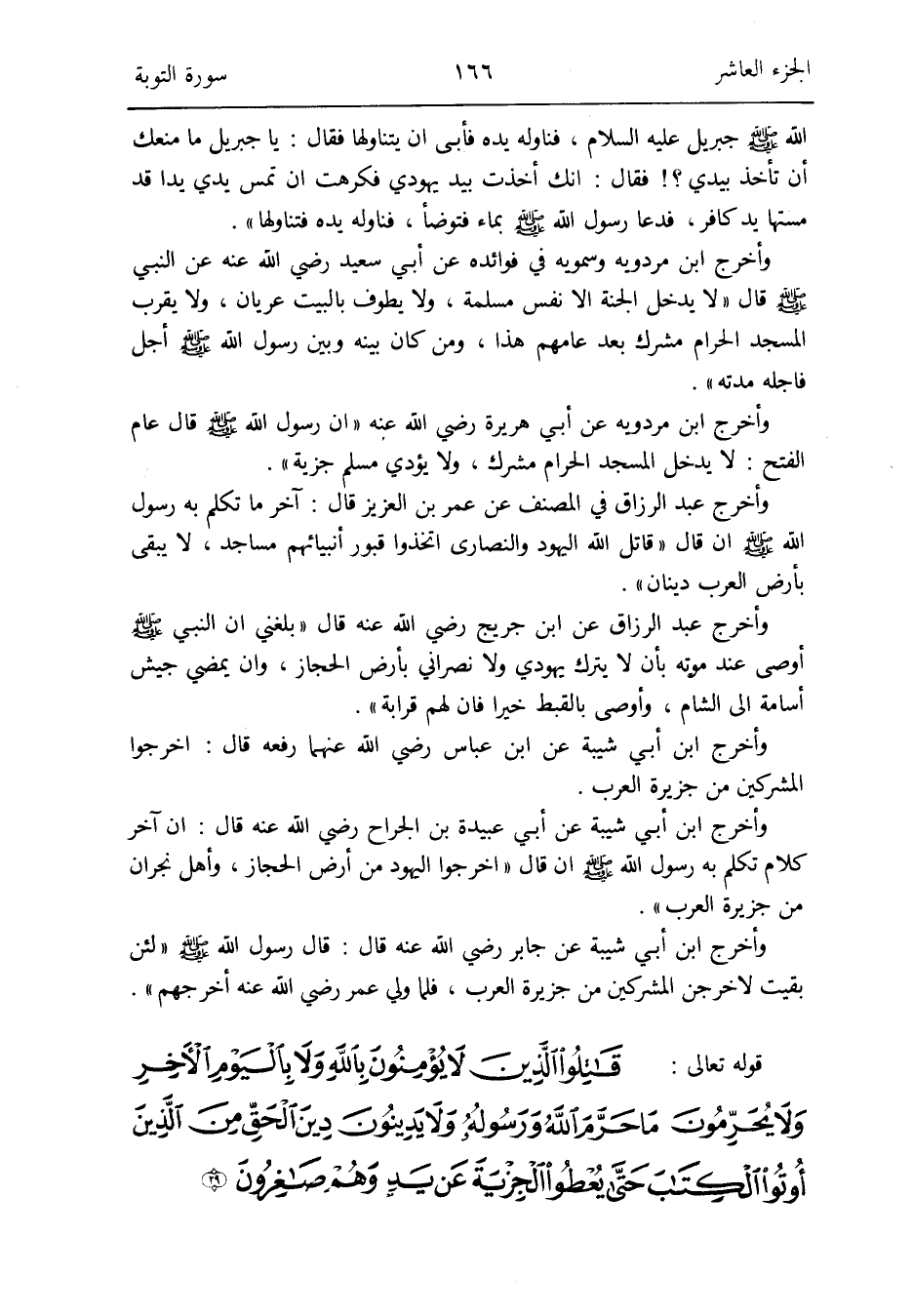 وَأخرج ابْن أبي شيبَة عَن ابْن عَبَّاس رَضِي الله عَنْهُمَا رَفعه قَالَ: اخْرُجُوا الْمُشْركين من جَزِيرَة الْعَرَب