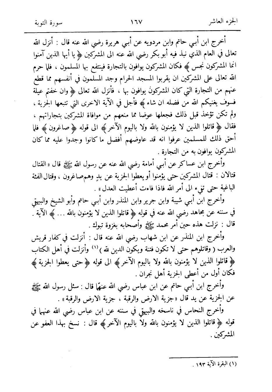 وَأخرج النّحاس فِي ناسخه وَالْبَيْهَقِيّ فِي سنَنه عَن ابْن عَبَّاس رَضِي الله عَنْهُمَا فِي قَوْله {قَاتلُوا الَّذين لَا يُؤمنُونَ بِاللَّه وَلَا بِالْيَوْمِ الآخر} قَالَ: نسخ بِهَذَا الْعَفو عَن الْمُشْركين