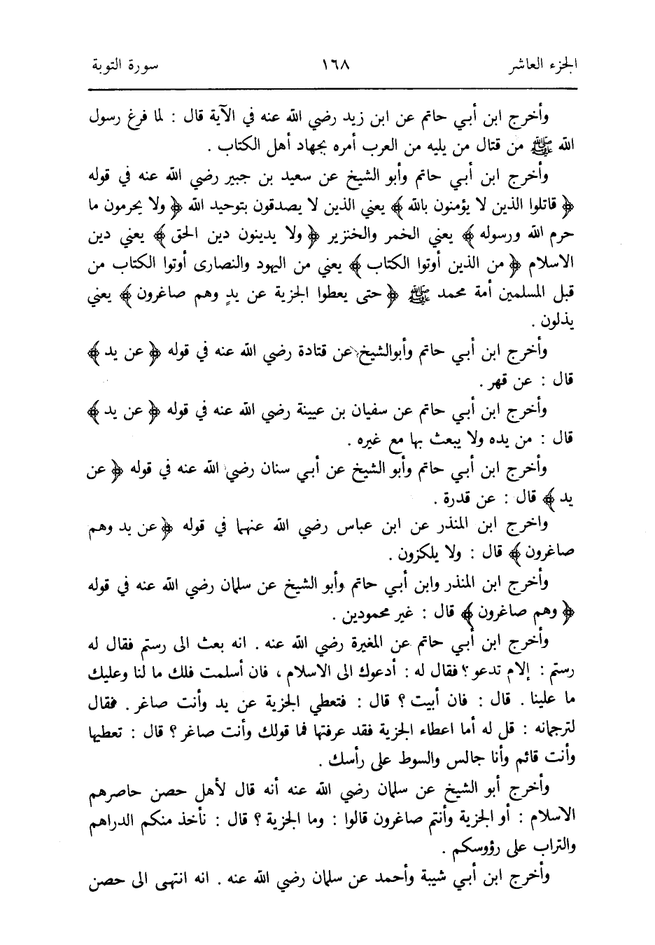 وَأخرج ابْن أبي حَاتِم وَأَبُو الشَّيْخ عَن سعيد بن جُبَير رَضِي الله عَنهُ فِي قَوْله {قَاتلُوا الَّذين لَا يُؤمنُونَ بِاللَّه} يَعْنِي الَّذين لَا يصدقون بتوحيد الله {وَلَا يحرمُونَ مَا حرم الله وَرَسُوله} يَعْنِي الْخمر وَالْخِنْزِير {وَلَا يدينون دين الْحق} يَعْنِي دين الإِسلام {من الَّذين أُوتُوا الْكتاب} يَعْنِي من الْيَهُود وَالنَّصَارَى أُوتُوا الْكتاب من قبل الْمُسلمين أمة مُحَمَّد صلى الله عَلَيْهِ وَسلم {حَتَّى يُعْطوا الْجِزْيَة عَن يدٍ وهم صاغرون} يَعْنِي يذلون