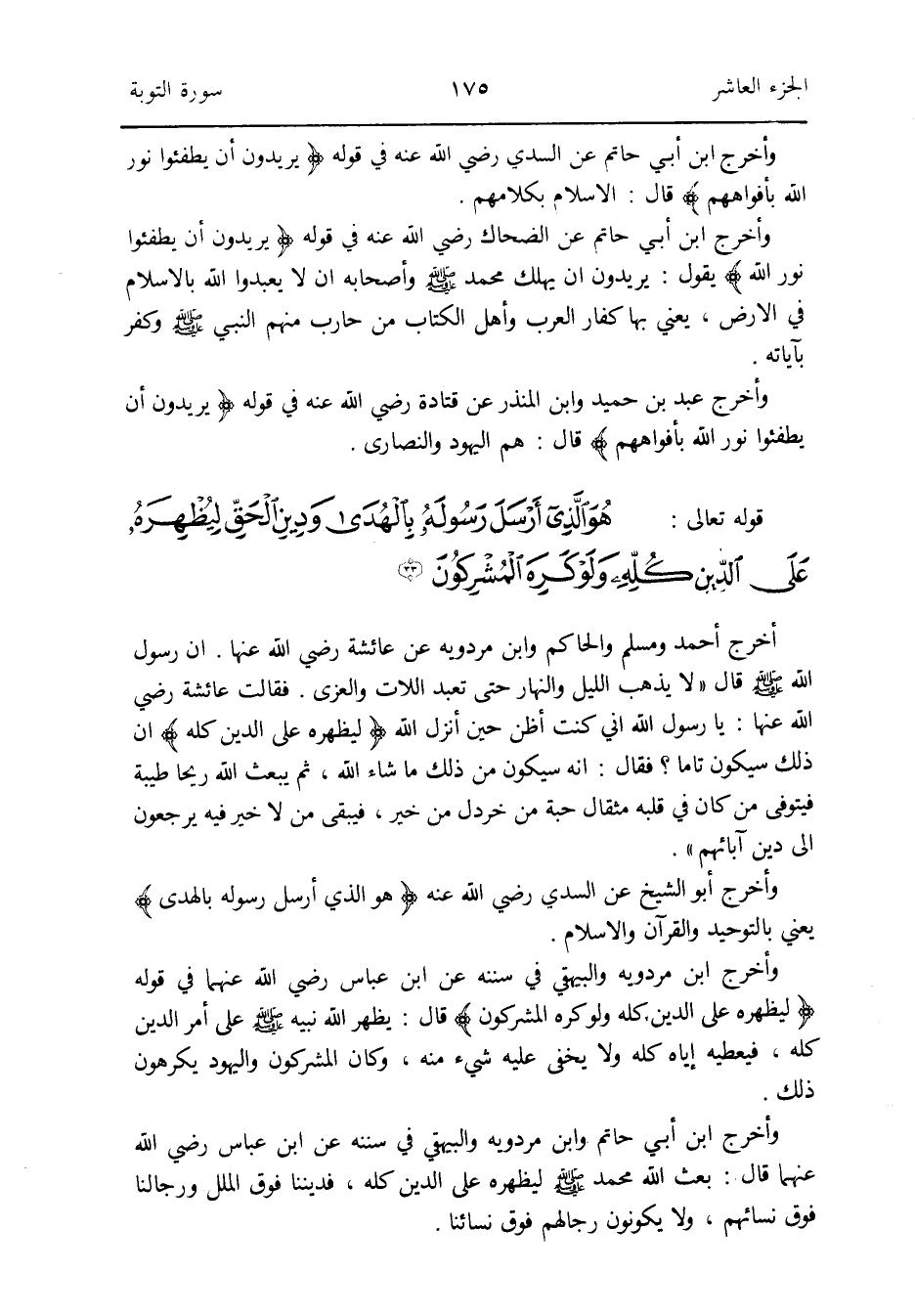 وَأخرج ابْن أبي حَاتِم عَن الضَّحَّاك رَضِي الله عَنهُ فِي قَوْله {يُرِيدُونَ أَن يطفئوا نور الله} يَقُول: يُرِيدُونَ أَن يهْلك مُحَمَّد صلى الله عَلَيْهِ وَسلم وَأَصْحَابه أَن لَا يعبدوا الله بالإِسلام فِي الأَرْض يَعْنِي بهَا كفار الْعَرَب وَأهل الْكتاب من حَارب مِنْهُم النب صلى الله عَلَيْهِ وَسلم ي وَكفر بآياته