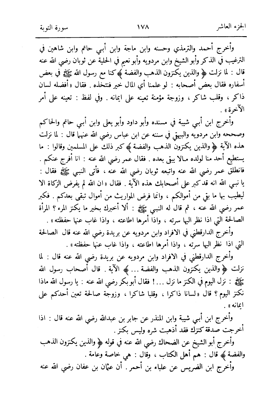 وَأخرج أَحْمد وَالتِّرْمِذِيّ وَحسنه وَابْن ماجة وَابْن أبي حَاتِم وَابْن شاهين فِي التَّرْغِيب فِي الذّكر وَأَبُو الشَّيْخ وَابْن مرْدَوَيْه وَأَبُو نعيم فِي الْحِلْية عَن ثَوْبَان رَضِي الله عَنهُ قَالَ: لما نزلت {وَالَّذين يكنزون الذَّهَب وَالْفِضَّة} كُنَّا مَعَ رَسُول الله صلى الله عَلَيْهِ وَسلم فِي بعض أَسْفَاره فَقَالَ لَهُ أَصْحَابه: لَو علمنَا أَي المَال خير فَنَتَّخِذهُ