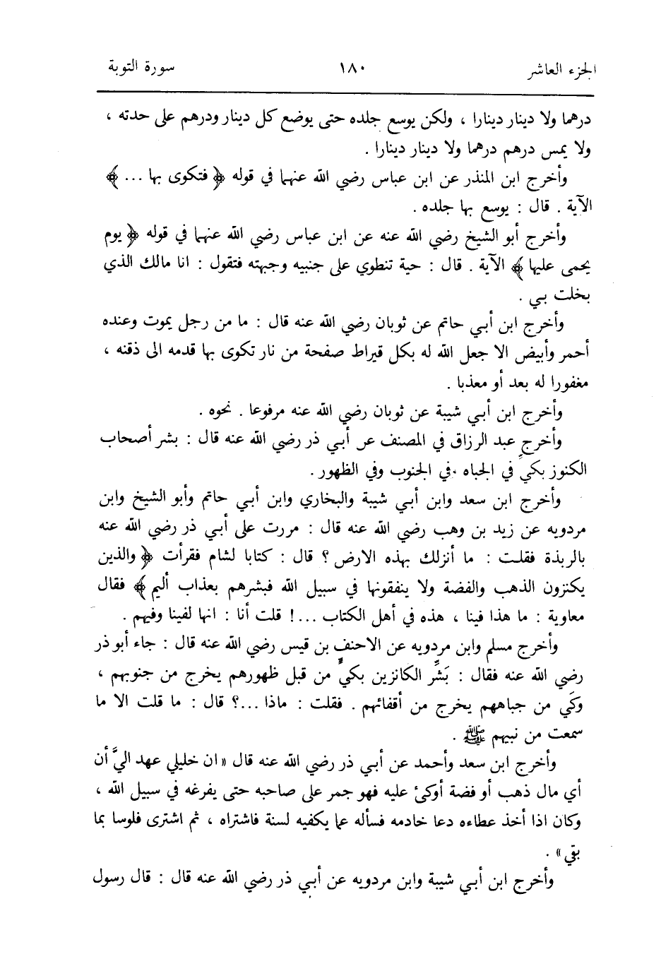 وَأخرج ابْن سعد وَابْن أبي شيبَة وَالْبُخَارِيّ وَابْن أبي حَاتِم وَأَبُو الشَّيْخ وَابْن مرْدَوَيْه عَن زيد بن وهب رَضِي الله عَنهُ قَالَ: مَرَرْت على أبي ذَر رَضِي الله عَنهُ بالربذة فَقلت: مَا أنزلك بِهَذِهِ الأَرْض قَالَ: كتابا لشام فَقَرَأت {وَالَّذين يكنزون الذَّهَب وَالْفِضَّة وَلَا يُنْفِقُونَهَا فِي سَبِيل الله فبشرهم بِعَذَاب أَلِيم} فَقَالَ مُعَاوِيَة: مَا هَذَا فِينَا هَذِه فِي أهل الْكتاب