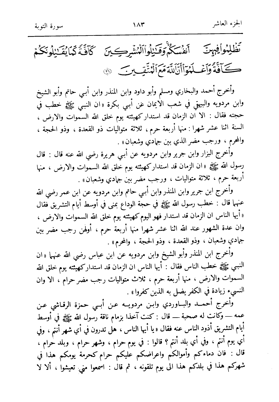 وَأخرج أَحْمد وَالْبُخَارِيّ وَمُسلم وَأَبُو دَاوُد وَابْن الْمُنْذر وَابْن أبي حَاتِم وَأَبُو الشَّيْخ وَابْن مرْدَوَيْه وَالْبَيْهَقِيّ فِي شعب الْإِيمَان عَن أبي بكرَة أَن النَّبِي صلى الله عَلَيْهِ وَسلم خطب فِي حجَّته فَقَالَ: أَلا إِن الزَّمَان قد اسْتَدَارَ كَهَيْئَته يَوْم خلق الله السَّمَوَات وَالْأَرْض السّنة اثْنَا عشر شهرا: مِنْهَا أَرْبَعَة حرم ثَلَاثَة مُتَوَالِيَات ذُو الْعقْدَة وَذُو الْحجَّة وَالْمحرم وَرَجَب مُضر الَّذِي بَين جُمَادَى وَشَعْبَان