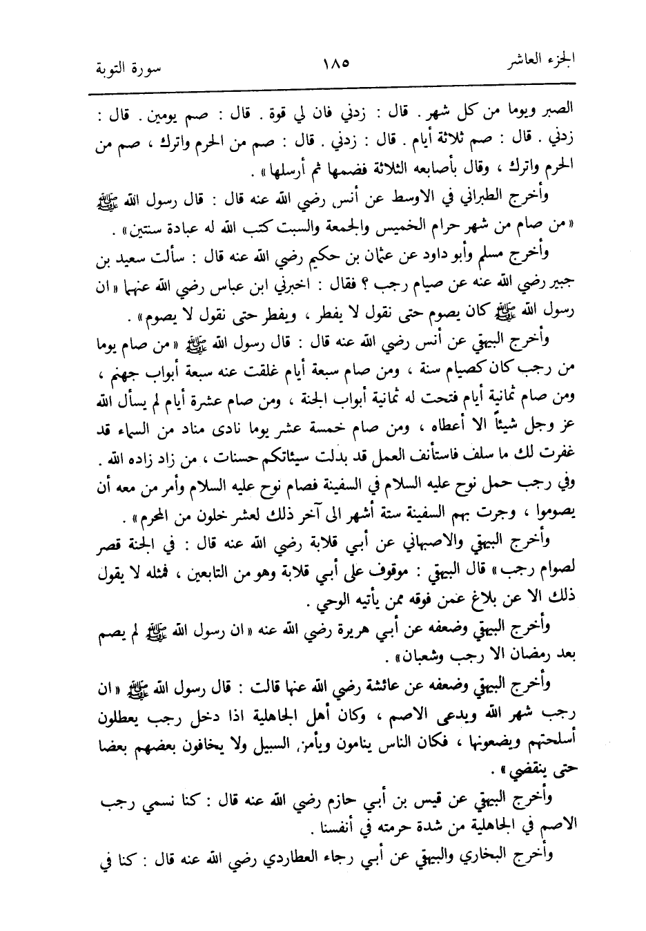 وَأخرج مُسلم وَأَبُو دَاوُد عَن عُثْمَان بن حَكِيم رَضِي الله عَنهُ قَالَ: سَأَلت سعيد بن جُبَير رَضِي الله عَنهُ عَن صِيَام رَجَب فَقَالَ: اخبرني ابْن عَبَّاس رَضِي الله عَنْهُمَا أَن رَسُول الله صلى الله عَلَيْهِ وَسلم كَانَ يَصُوم حَتَّى نقُول لَا يفْطر وَيفْطر حَتَّى نقُول لَا يَصُوم