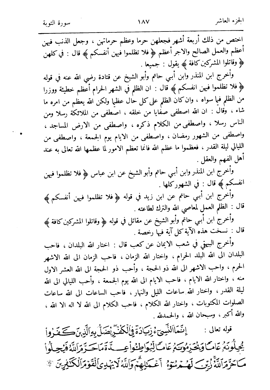 وَأخرج ابْن الْمُنْذر وَابْن أبي حَاتِم وَأَبُو الشَّيْخ عَن ابْن عَبَّاس {فَلَا تظلموا فِيهِنَّ أَنفسكُم} قَالَ: فِي الشُّهُور كلهَا