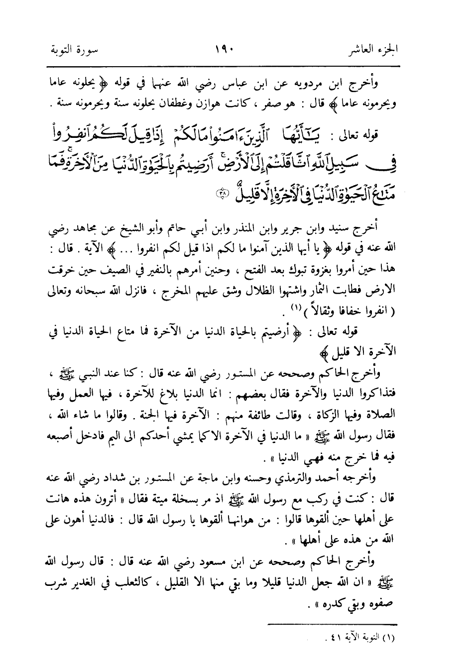 أخرج سنيد وَابْن جرير وَابْن الْمُنْذر وَابْن أبي حَاتِم وَأَبُو الشَّيْخ عَن مُجَاهِد رَضِي الله عَنهُ فِي قَوْله {يَا أَيهَا الَّذين آمنُوا مَا لكم إِذا قيل لكم انفروا} الْآيَة