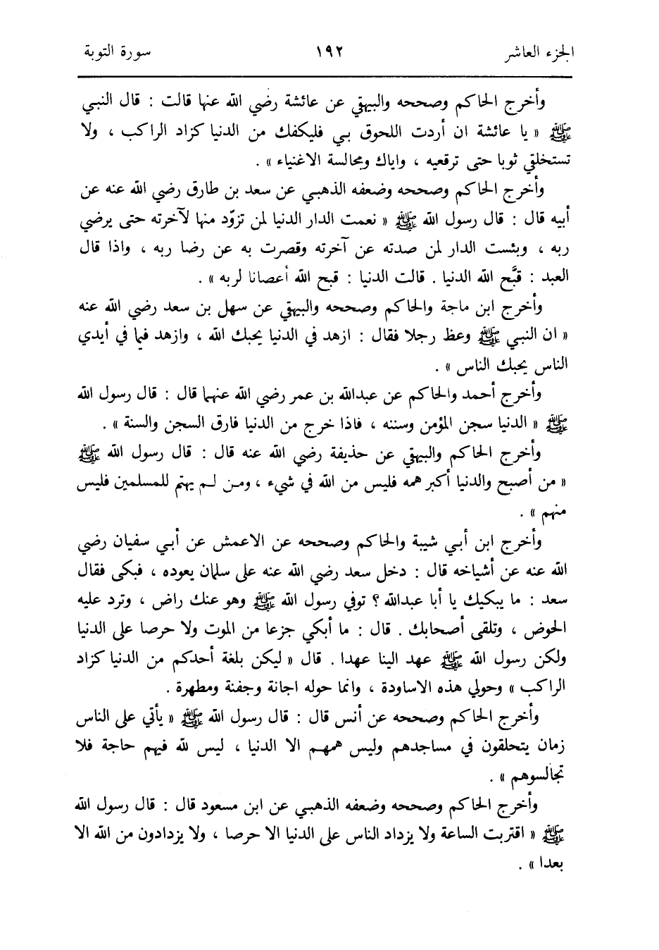 وَأخرج الْحَاكِم وَصَححهُ وَالْبَيْهَقِيّ عَن عَائِشَة رَضِي الله عَنْهَا قَالَت: قَالَ النَّبِي صلى الله عَلَيْهِ وَسلم يَا عَائِشَة إِن أردْت اللحوق بِي فليكفك من الدُّنْيَا كزاد الرَّاكِب وَلَا تستخلفي ثوبا حَتَّى ترقعيه وَإِيَّاك ومجالسة الْأَغْنِيَاء