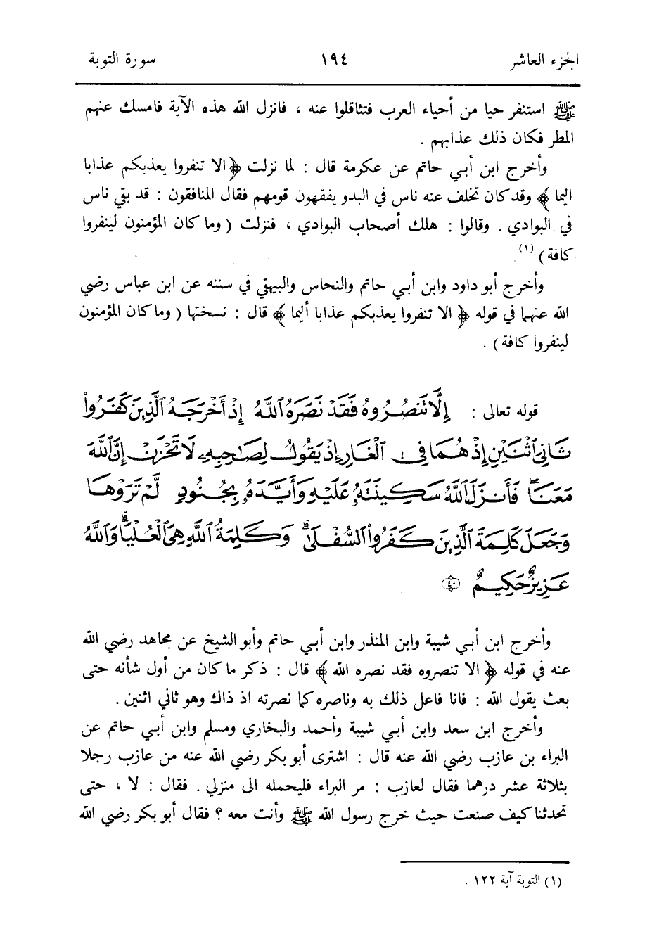 وَأخرج ابْن أبي شيبَة وَابْن الْمُنْذر وَابْن أبي حَاتِم وَأَبُو الشَّيْخ عَن مُجَاهِد رَضِي الله عَنهُ فِي قَوْله {إِلَّا تنصروه فقد نَصره الله} قَالَ: ذكر مَا كَانَ من أول شَأْنه حَتَّى بعث يَقُول الله: فَأَنا فَاعل ذَلِك بِهِ وناصره كَمَا نصرته إِذْ ذَاك وَهُوَ ثَانِي اثْنَيْنِ