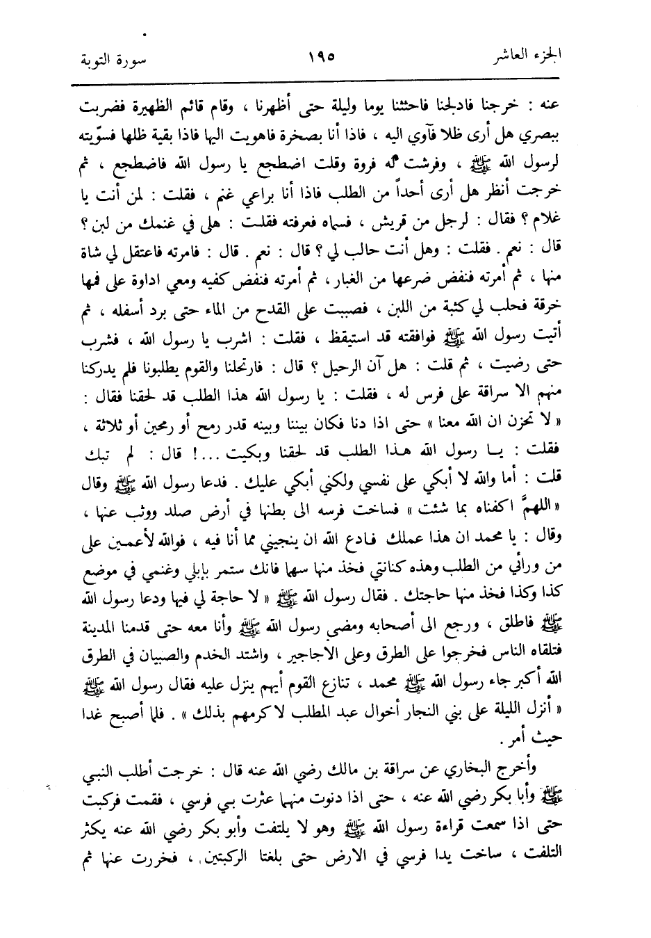 وَأخرج البُخَارِيّ عَن سراقَة بن مَالك رَضِي الله عَنهُ قَالَ: خرجت أطلب النَّبِي صلى الله عَلَيْهِ وَسلم وَأَبا بكر رَضِي الله عَنهُ حَتَّى إِذا دَنَوْت مِنْهُمَا عثرت بِي فرسي فَقُمْت فركبت حَتَّى إِذا سَمِعت قِرَاءَة رَسُول الله صلى الله عَلَيْهِ وَسلم وَهُوَ لَا يلْتَفت وَأَبُو بكر رَضِي الله عَنهُ يكثر التلفت ساخت يدا فرسي فِي الأَرْض حَتَّى بلغتا الرُّكْبَتَيْنِ فَخَرَرْت عَنْهَا ثمَّ