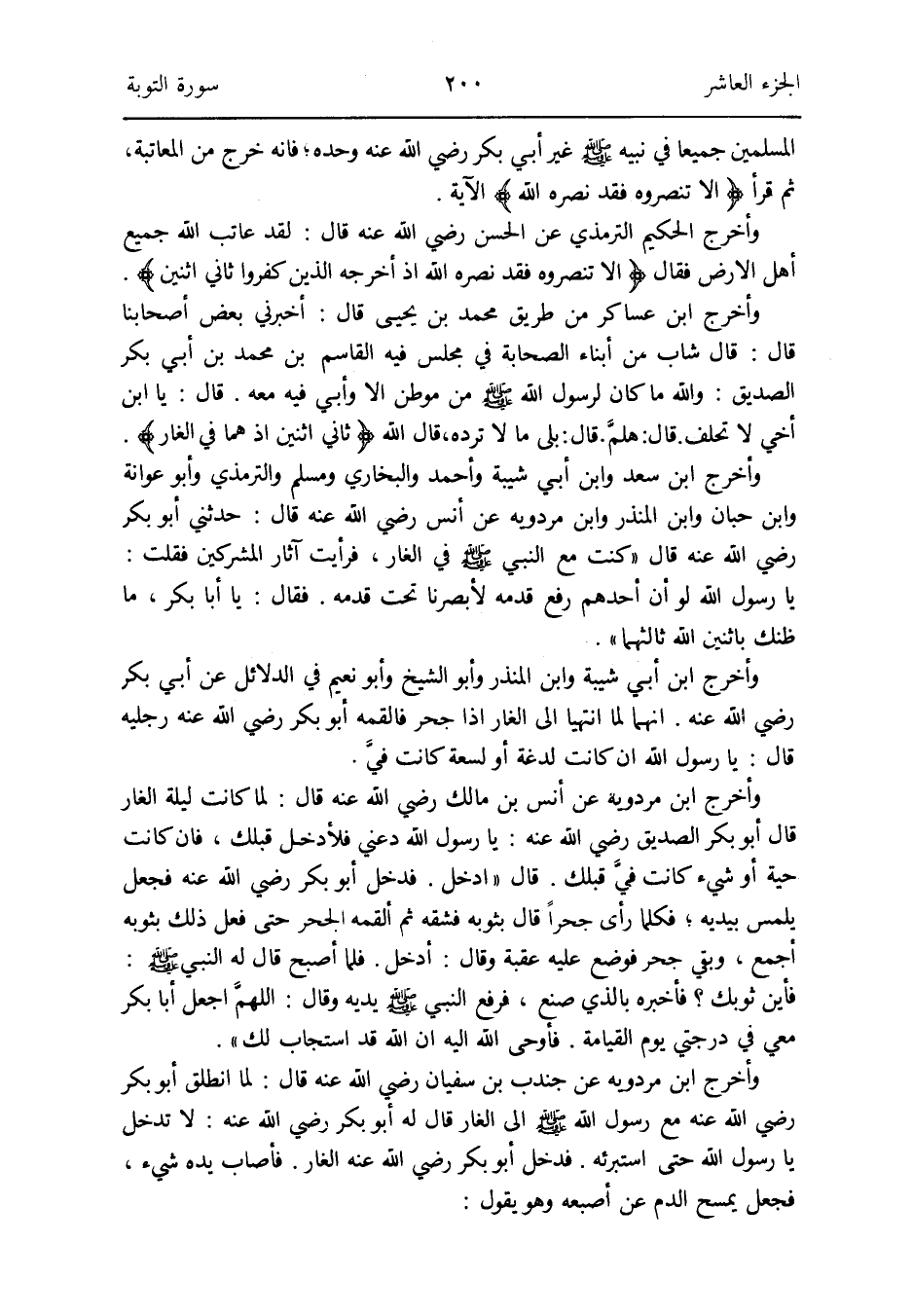 وَأخرج الْحَكِيم التِّرْمِذِيّ عَن الْحسن رَضِي الله عَنهُ قَالَ: لقد عَاتب الله جَمِيع أهل الأَرْض فَقَالَ {إِلَّا تنصروه فقد نَصره الله إِذْ أخرجه الَّذين كفرُوا ثَانِي اثْنَيْنِ}