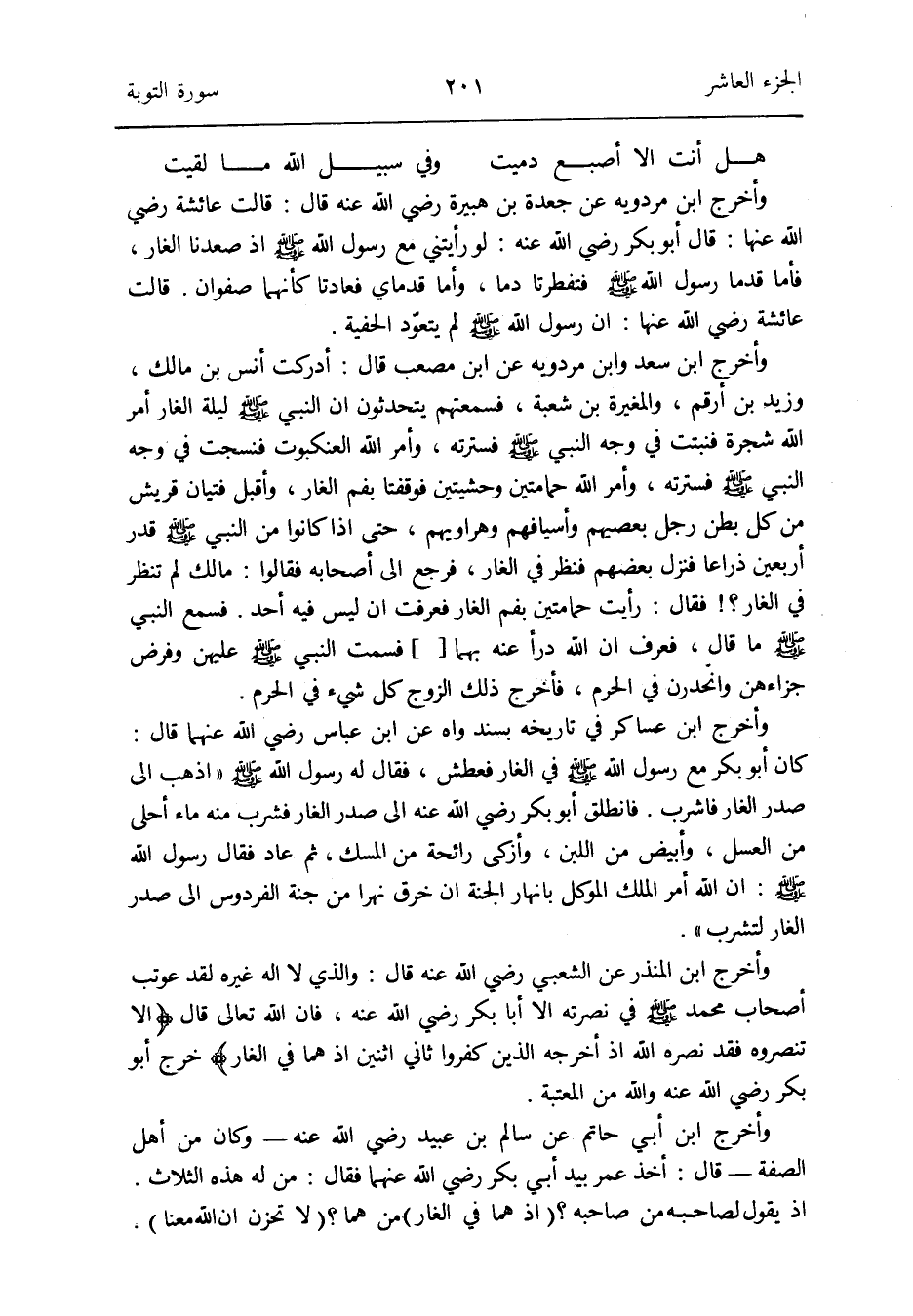 هَل أَنْت إِلَّا أصْبع دميت وَفِي سَبِيل الله مَا لقِيت وَأخرج ابْن مرْدَوَيْه عَن جعدة بن هُبَيْرَة رَضِي الله عَنهُ قَالَ: قَالَت عَائِشَة رَضِي الله عَنْهَا: قَالَ أَبُو بكر رَضِي الله عَنهُ: لَو رَأَيْتنِي مَعَ رَسُول الله صلى الله عَلَيْهِ وَسلم إِذْ صعدنا الْغَار فَأَما قدما رَسُول الله صلى الله عَلَيْهِ وَسلم فتفطرتا دَمًا وَأما قَدَمَايَ فعادتا كَأَنَّهُمَا صَفْوَان