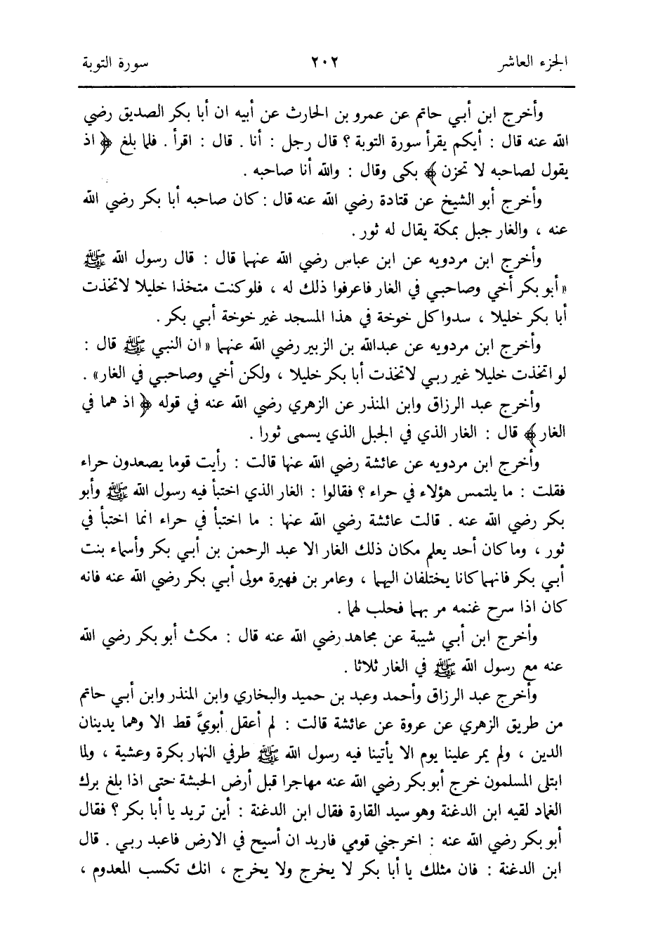 وَأخرج عبد الرَّزَّاق وَأحمد وَعبد بن حميد وَالْبُخَارِيّ وَابْن الْمُنْذر وَابْن أبي حَاتِم من طَرِيق الزُّهْرِيّ عَن عُرْوَة عَن عَائِشَة قَالَت: لم أَعقل أبويَّ قطّ إِلَّا وهما يدينان الدّين وَلم يمر علينا يَوْم إِلَّا يأتينا فِيهِ رَسُول الله صلى الله عَلَيْهِ وَسلم طرفِي النَّهَار بكرَة وَعَشِيَّة وَلما ابْتُلِيَ الْمُسلمُونَ خرج أَبُو بكر رَضِي الله عَنهُ مُهَاجرا قبل أَرض الْحَبَشَة حَتَّى إِذا بلغ برك الغماد لقِيه ابْن الدغنة وَسيد القارة فَقَالَ ابْن الدغنة: أَيْن تُرِيدُ يَا أَبَا بكر فَقَالَ أَبُو بكر رَضِي الله عَنهُ: أخرجني قومِي فَأُرِيد أَن أسيح فِي الأَرْض فأعبد رَبِّي