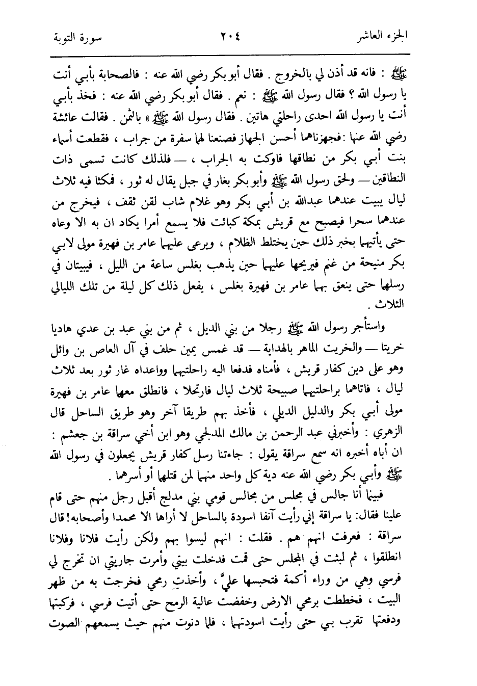 واستأجر رَسُول الله صلى الله عَلَيْهِ وَسلم رجلا من بني الديل ثمَّ من بني عبد بن عدي هاديا خريتا - والخريت الماهر بالهداية - قد غمس يَمِين حلف فِي آل الْعَاصِ بن وَائِل وَهُوَ على دين كفار قُرَيْش فأمناه فدفعا إِلَيْهِ راحلتيهما وواعداه غَار ثَوْر بعد ثَلَاث لَيَال فأتاهما براحلتيهما صَبِيحَة ثَلَاث لَيَال فارتحلا فانطل مَعَهُمَا عَامر بن فهَيْرَة مولى أبي بكر وَالدَّلِيل الديلِي فَأخذ بهم طَرِيقا آخر وَهُوَ طَرِيق السَّاحِل قَالَ الزُّهْرِيّ: أَخْبرنِي عبد الرَّحْمَن بن مَالك المدلجي وَهُوَ ابْن أخي سراقَة بن حعشم: إِن أَبَاهُ أخبرهُ أَنه سمع سراقَة يَقُول: جاءتنا رسل كفار قُرَيْش يجْعَلُونَ فِي رَسُول الله صلى الله عَلَيْهِ وَسلم وَأبي بكر رَضِي الله عَنهُ دِيَة كل وَاحِد مِنْهُمَا لمن قَتلهمَا أَو أسرهما