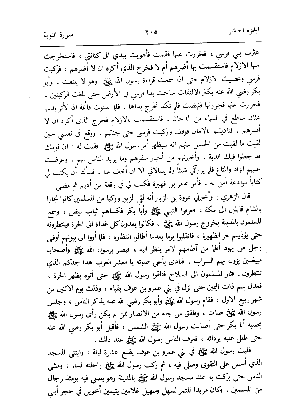 فَلبث رَسُول الله صلى الله عَلَيْهِ وَسلم فِي بني عَمْرو بن عَوْف بضع عشرَة لَيْلَة وابتنى الْمَسْجِد الَّذِي أسس على التَّقْوَى وَصلى فِيهِ ثمَّ ركب رَسُول الله صلى الله عَلَيْهِ وَسلم رَاحِلَته فَسَار وَمَشى النَّاس حَتَّى بَركت بِهِ عِنْد مَسْجِد رَسُول الله بِالْمَدِينَةِ وَهُوَ يُصَلِّي فِيهِ يَوْمئِذٍ رجال من الْمُسلمين وَكَانَ مربدا للتمر لسهل وَسُهيْل غلامين يتمين أَخَوَيْنِ فِي حجر أبي