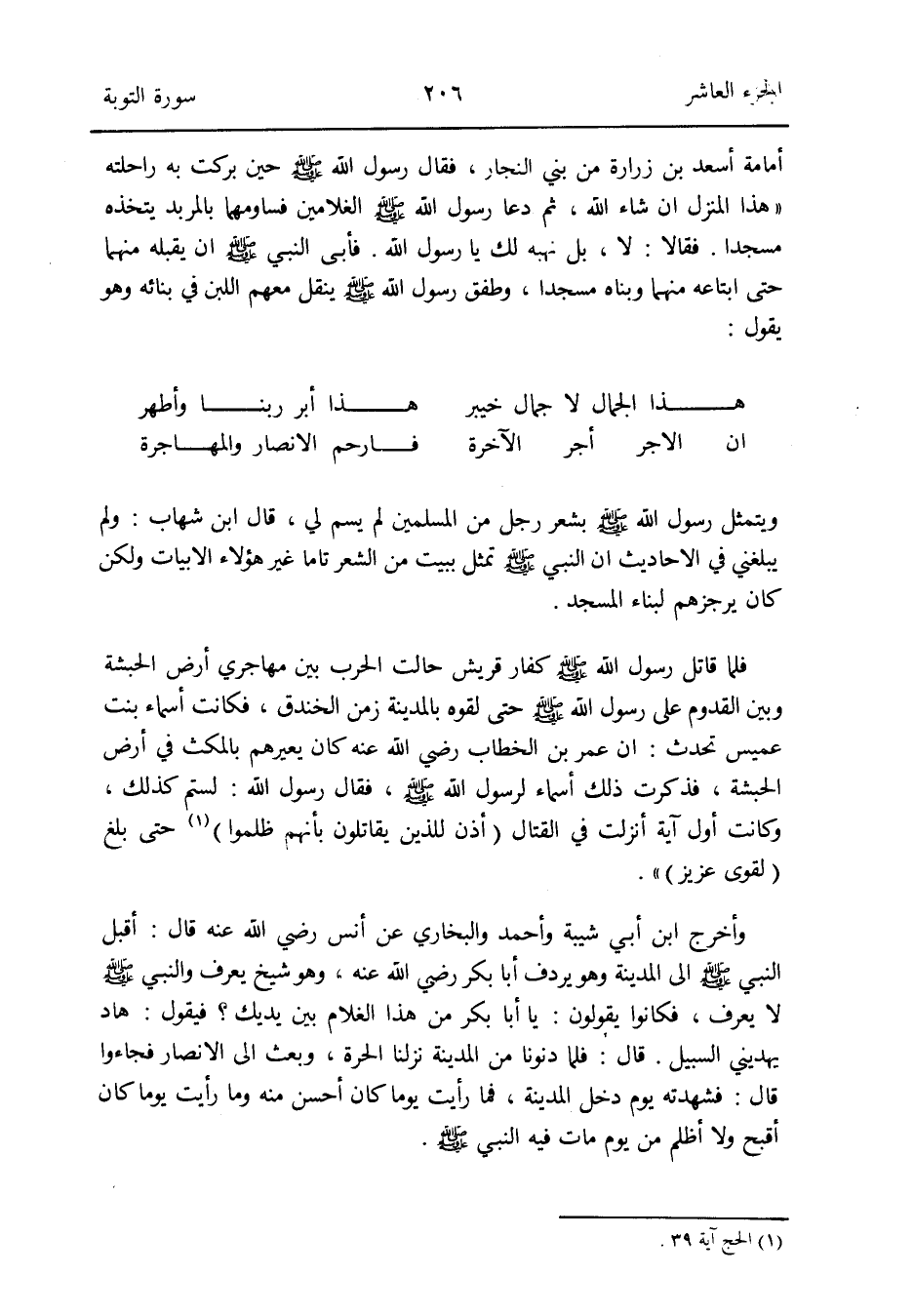 فَأبى النَّبِي صلى الله عَلَيْهِ وَسلم أَن يقبله مِنْهُمَا حَتَّى ابتاعه مِنْهُمَا وبناه مَسْجِدا وطفق رَسُول الله صلى الله عَلَيْهِ وَسلم ينْقل مَعَهم اللَّبن فِي بنائِهِ وَهُوَ يَقُول: هَذَا الْجمال لَا جمال خَيْبَر هَذَا أبر رَبنَا وأطهر إِن الْأجر أجر الْآخِرَة فَارْحَمْ الْأَنْصَار والمهاجرة ويتمثل رَسُول الله صلى الله عَلَيْهِ وَسلم بِشعر رجل من الْمُسلمين لم يسم لي قَالَ ابْن شهَاب: وَلم يبلغنِي فِي الْأَحَادِيث أَن النَّبِي صلى الله عَلَيْهِ وَسلم تمثل بِبَيْت من الشّعْر تَاما غير هَؤُلَاءِ الأبيات وَلَكِن يرجزهم لبِنَاء الْمَسْجِد