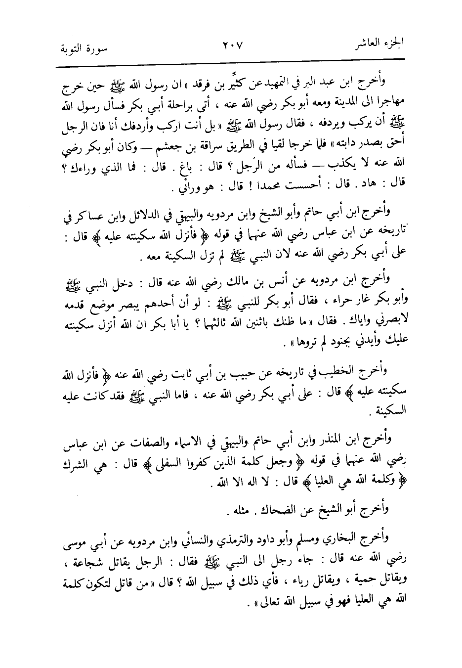 وَأخرج البخاريي وَمُسلم وَأَبُو دَاوُد وَالتِّرْمِذِيّ وَالنَّسَائِيّ وَابْن مرْدَوَيْه عَن أبي مُوسَى رَضِي الله عَنهُ قَالَ: جَاءَ رجل إِلَى النَّبِي صلى الله عَلَيْهِ وَسلم فَقَالَ: الرجل يُقَاتل شجاعة وَيُقَاتل حمية وَيُقَاتل رِيَاء فَأَي ذَلِك فِي سَبِيل الله قَالَ من قَاتل لتَكون كلمة الله هِيَ الْعليا فَهُوَ فِي سَبِيل الله تَعَالَى