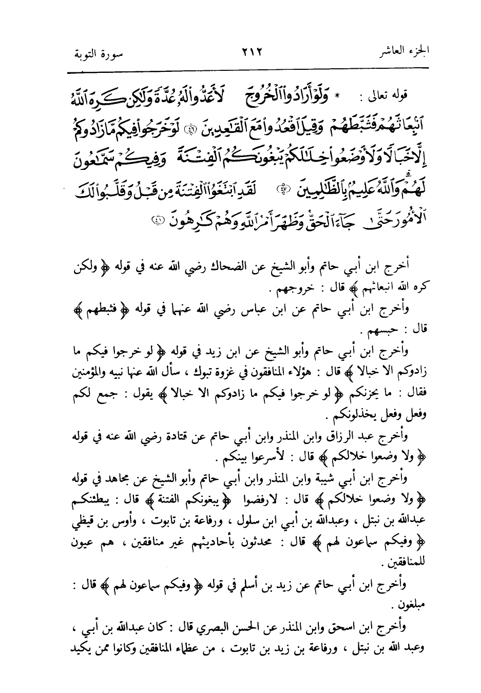 أخرج ابْن أبي حَاتِم وَأَبُو الشَّيْخ عَن الضَّحَّاك رَضِي الله عَنهُ فِي قَوْله {وَلَكِن كره الله انبعاثهم} قَالَ: خُرُوجهمْ