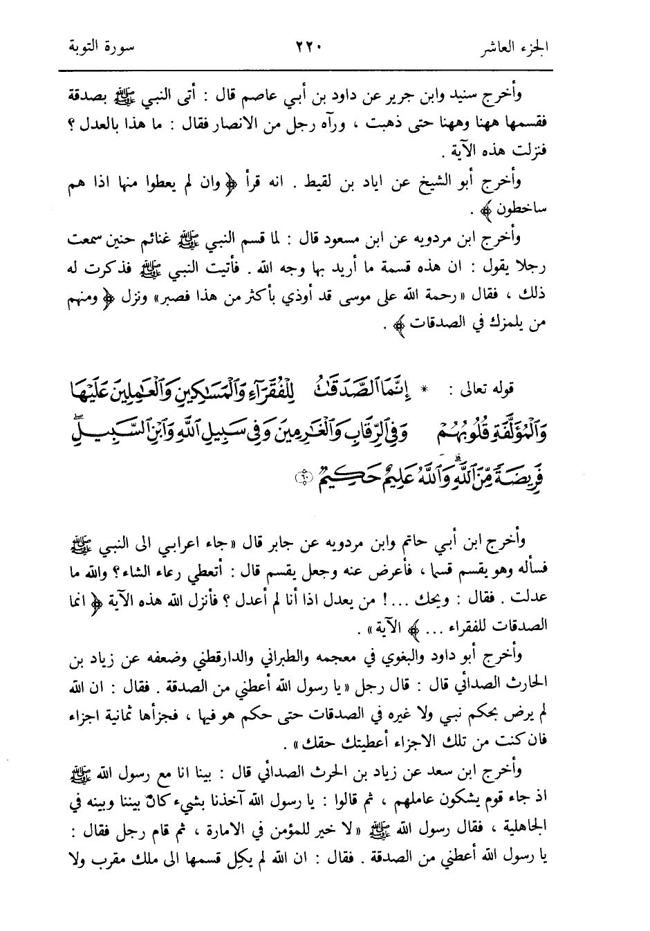 وَأخرج سنيد وَابْن جرير عَن دَاوُد بن أبي عَاصِم قَالَ: أَتَى النَّبِي صلى الله عَلَيْهِ وَسلم بِصَدقَة فَقَسمهَا هَهُنَا وَهَهُنَا حَتَّى ذهبت وَرَآهُ رجل من الْأَنْصَار فَقَالَ: مَا هَذَا بِالْعَدْلِ فَنزلت هَذِه الْآيَة