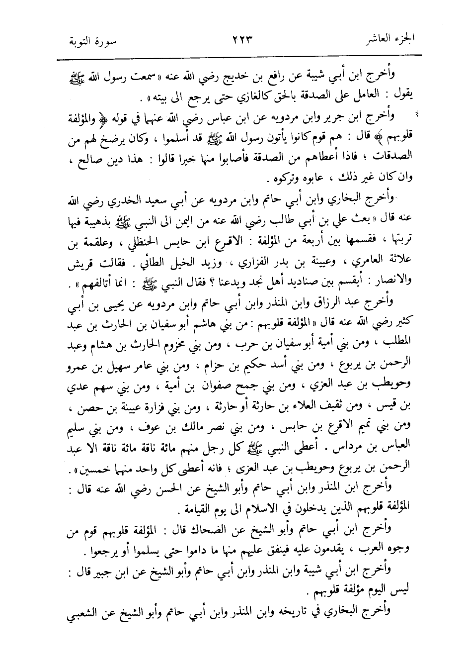 وَأخرج ابْن جرير وَابْن مرْدَوَيْه عَن ابْن عَبَّاس رَضِي الله عَنْهُمَا فِي قَوْله {والمؤلفة قُلُوبهم} قَالَ: هم قوم كَانُوا يأْتونَ رَسُول الله صلى الله عَلَيْهِ وَسلم قد أَسْلمُوا وَكَانَ يرْضخ لَهُم من الصَّدقَات فَإِذا أَعْطَاهُم من الصَّدَقَة فَأَصَابُوا مِنْهَا خيرا قَالُوا: هَذَا دين صَالح وَإِن كَانَ غير ذَلِك عابوه وتركوه