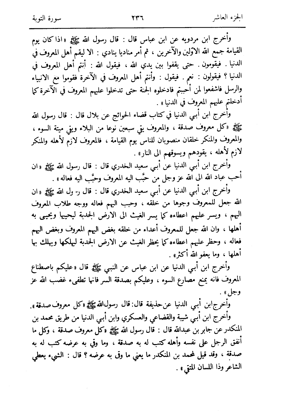 وَأخرج ابْن أبي الدُّنْيَا عَن أبي سعيد الْخُدْرِيّ قَالَ: قَالَ رَسُول الله صلى الله عَلَيْهِ وَسلم إِن الله جعل للمعروف وُجُوهًا من خلقه وحبب إِلَيْهِم فعاله وَوجه طلاب الْمَعْرُوف إِلَيْهِم وَيسر عَلَيْهِم إعطاءه كَمَا يسر الْغَيْث إِلَى الأَرْض الجدبة ليحييها ويحيي بِهِ أَهلهَا وَإِن الله جعل للمعروف أَعدَاء من خلقه بغض إِلَيْهِم الْمَعْرُوف وبغض إِلَيْهِم فعاله وحظر عَلَيْهِم اعطاءه كَمَا يحظر الْغَيْث عَن الأَرْض الجدبة ليهلكها وَيهْلك بهَا أَهلهَا وَمَا يعْفُو الله أَكثر