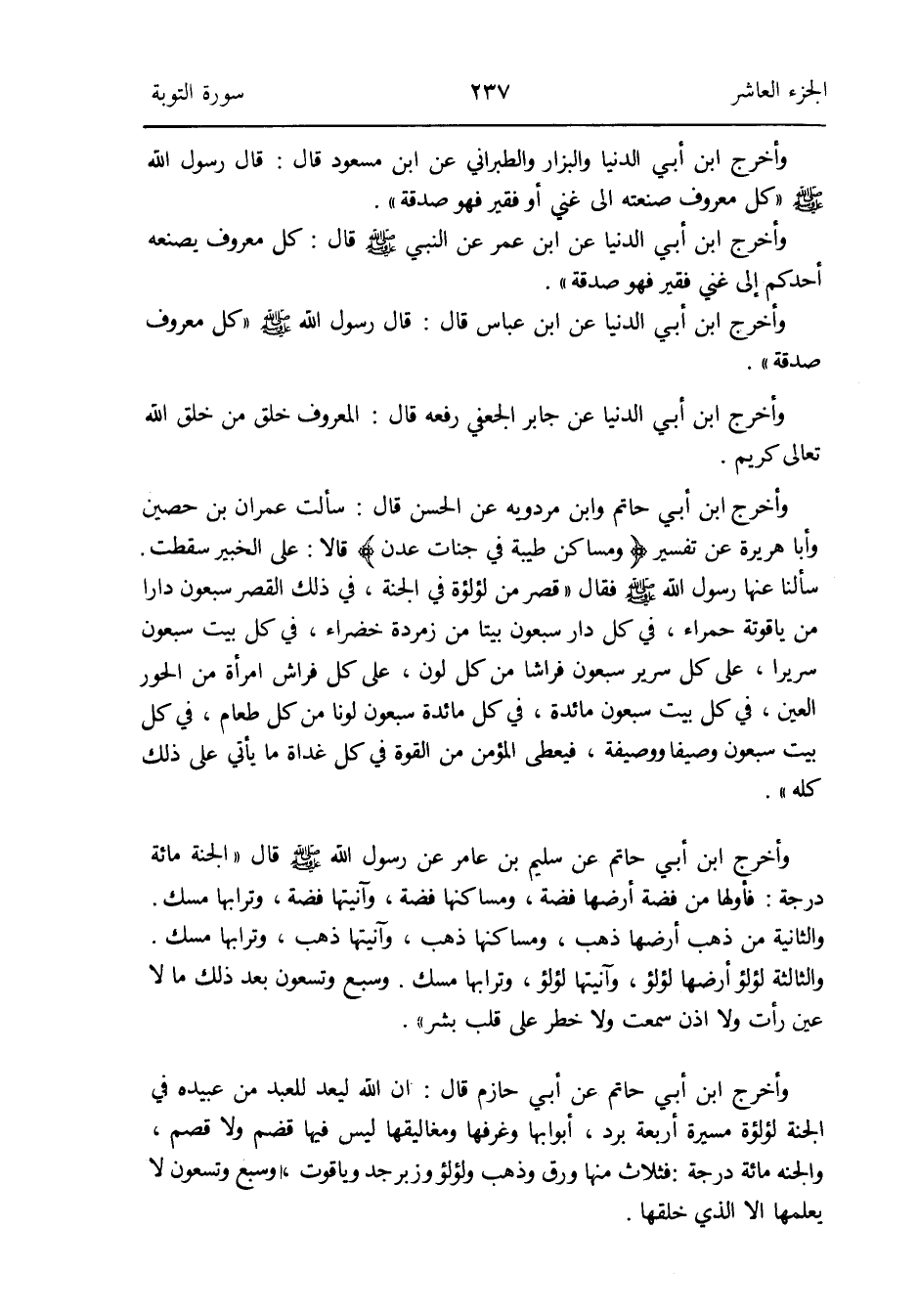 وَأخرج ابْن أبي حَاتِم عَن أبي حَازِم قَالَ: إِن الله ليعد للْعَبد من عبيده فِي الْجنَّة لؤلؤة مسيرَة أَرْبَعَة برد أَبْوَابهَا وغرفها ومغاليقها لَيْسَ فِيهَا قضم وَلَا قَصم وَالْجنَّة مائَة دَرَجَة: فَثَلَاث مِنْهَا ورق وَذهب ولؤلؤ وَزَبَرْجَد وَيَاقُوت وَسبع وَتسْعُونَ لَا يعلمهما إِلَّا الَّذِي خلقهَا