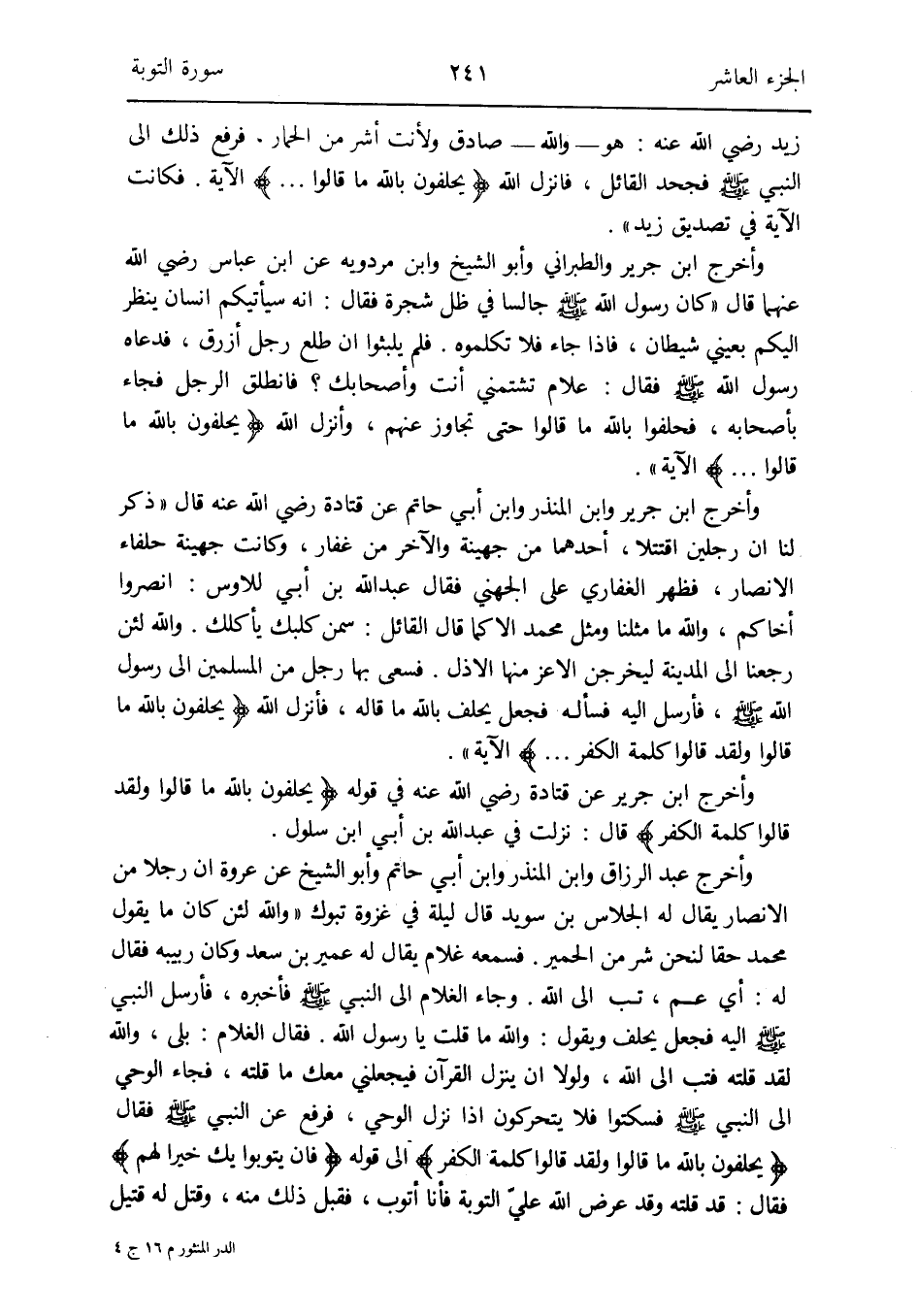 وَأخرج ابْن جرير عَن قَتَادَة رَضِي الله عَنهُ فِي قَوْله {يحلفُونَ بِاللَّه مَا قَالُوا وَلَقَد قَالُوا كلمة الْكفْر} قَالَ: نزلت فِي عبد الله بن أبي بن سلول