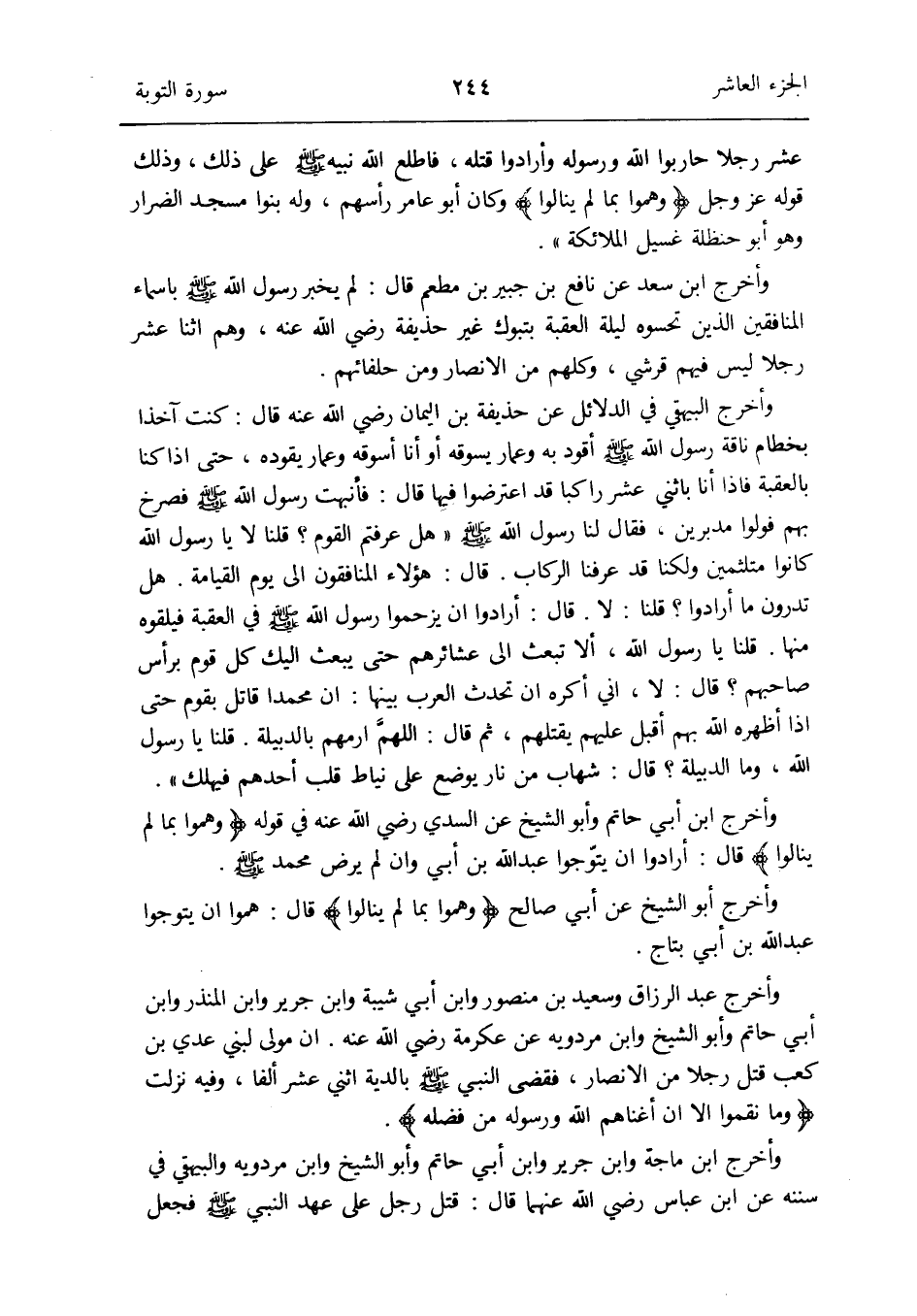 عشر رجلا حَاربُوا الله وَرَسُوله وَأَرَادُوا قَتله فَأطلع الله نبيه صلى الله عَلَيْهِ وَسلم على ذَلِك وَذَلِكَ قَوْله عز وَجل {وهموا بِمَا لم ينالوا} وَكَانَ أَبُو عَامر رَأْسهمْ وَله بنوا مَسْجِد الضرار وَهُوَ أَبُو حَنْظَلَة غسيل الْمَلَائِكَة