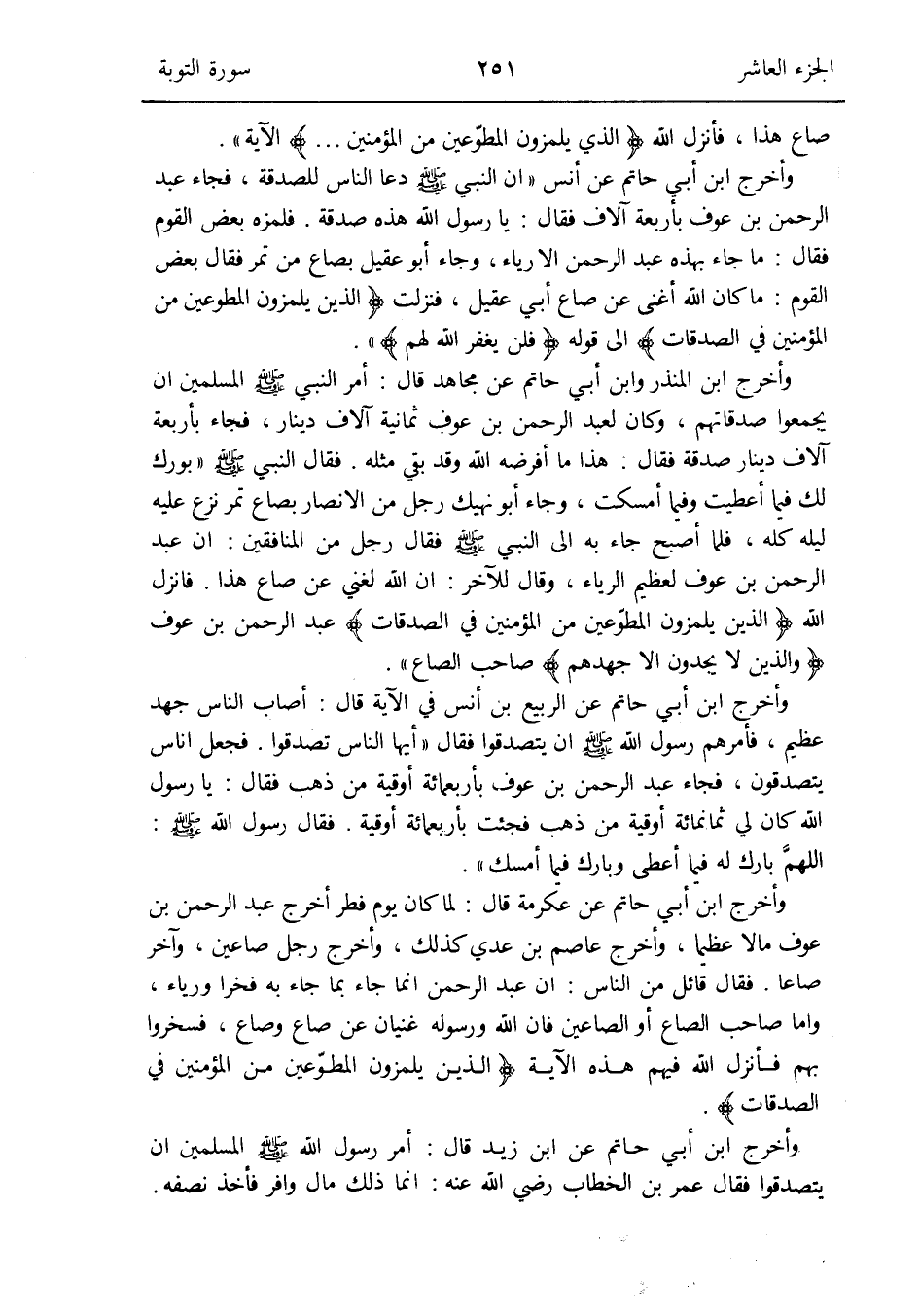فَأنْزل الله {الَّذين يَلْمِزُونَ الْمُطوِّعين من الْمُؤمنِينَ فِي الصَّدقَات} عبد الرَّحْمَن بن عَوْف {وَالَّذين لَا يَجدونَ إِلَّا جهدهمْ} صَاحب الصَّاع