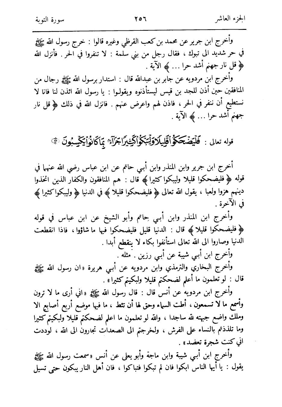 أخرج ابْن جرير وَابْن الْمُنْذر وَابْن أبي حَاتِم عَن ابْن عَبَّاس رَضِي الله عَنْهُمَا فِي قَوْله {فليضحكوا قَلِيلا وليبكوا كثيرا} قَالَ: هم المُنَافِقُونَ وَالْكفَّار الَّذين اتَّخذُوا من دينهم هزوا وَلَعِبًا يَقُول الله تَعَالَى {فليضحكوا قَلِيلا} فِي الدُّنْيَا {وليبكوا كثيرا} فِي الْآخِرَة