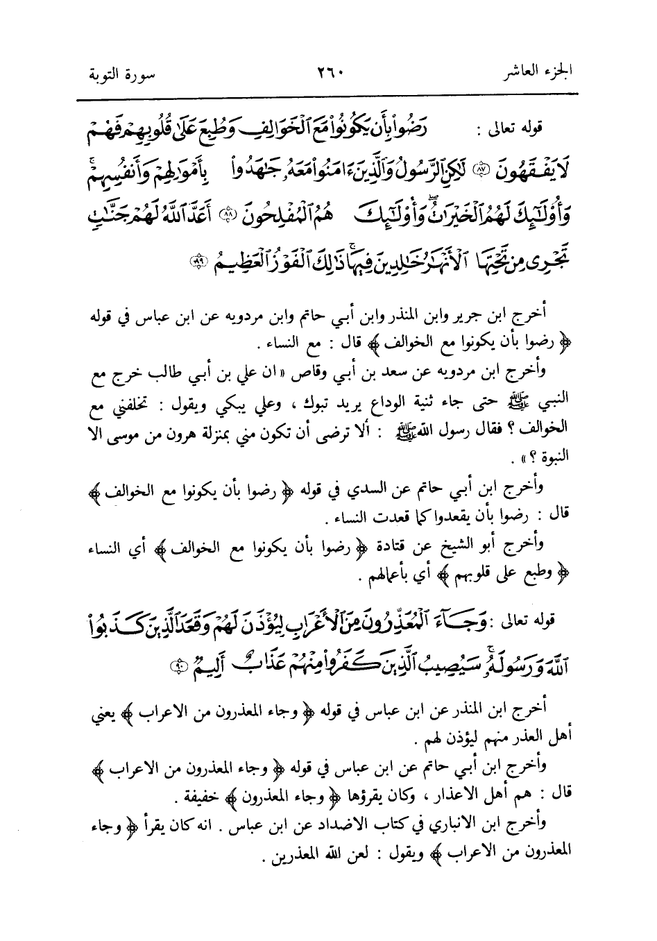 أخرج ابْن الْمُنْذر عَن ابْن عَبَّاس فِي قَوْله {وَجَاء المعذرون من الْأَعْرَاب} يَعْنِي أهل الْعذر مِنْهُم ليؤذن لَهُم