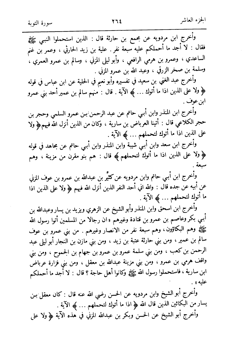 وَأخرج ابْن إِسْحَق وَابْن الْمُنْذر وَأَبُو الشَّيْخ عَن الزُّهْرِيّ وَيزِيد بن يسَار وَعبد الله بن أبي بكر وَعَاصِم بن عَمْرو بن قَتَادَة وَغَيرهم أَن رجَالًا من الْمُسلمين أَتَوا رَسُول الله صلى الله عَلَيْهِ وَسلم وهم البكاؤون وهم سَبْعَة نفر من الْأَنْصَار وَغَيرهم