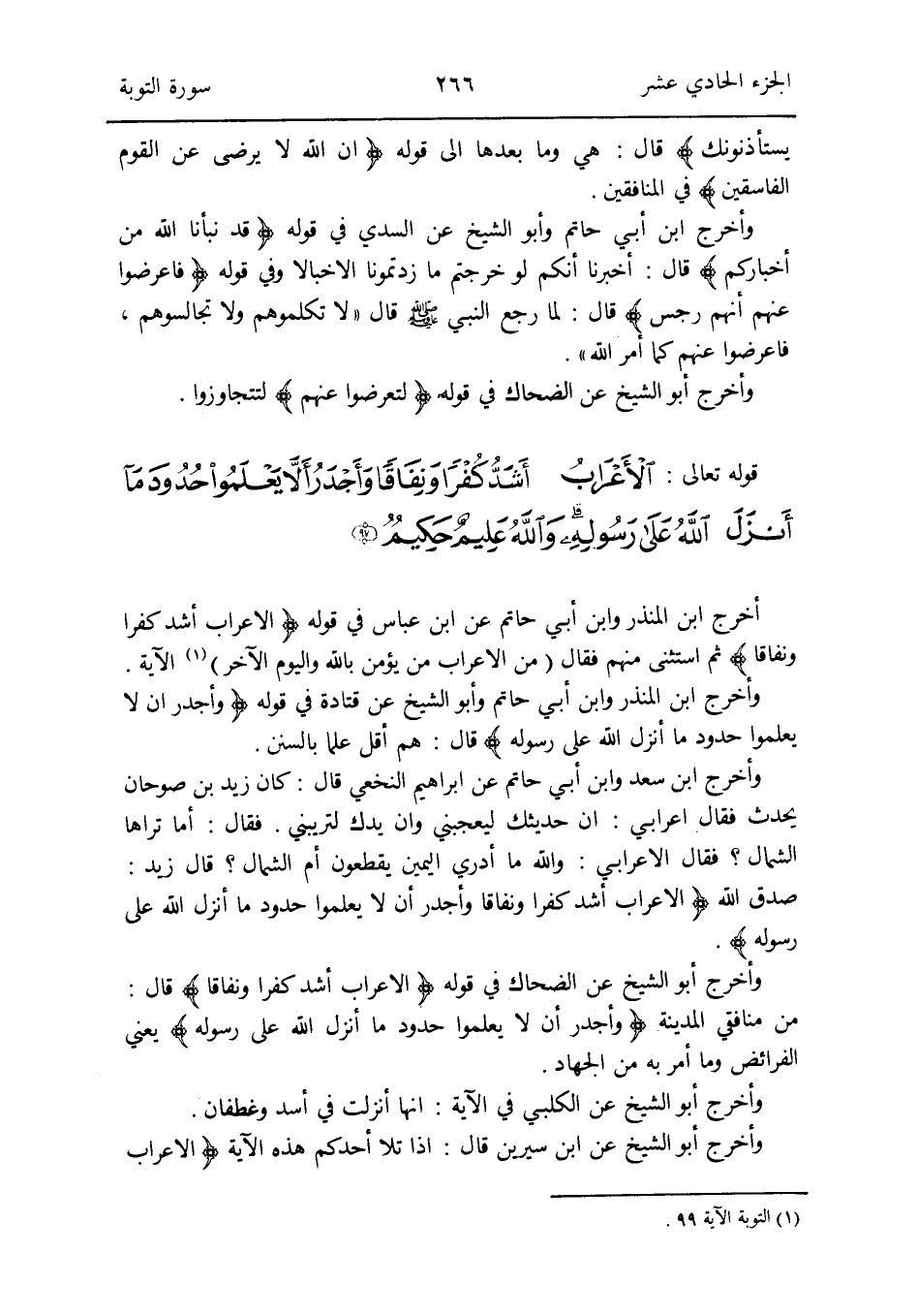أخرج ابْن الْمُنْذر وَابْن أبي حَاتِم عَن ابْن عَبَّاس فِي قَوْله {الْأَعْرَاب أَشد كفرا ونفاقاً} ثمَّ اسْتثْنى مِنْهُم فَقَالَ (من الْأَعْرَاب من يُؤمن بِاللَّه وَالْيَوْم الآخر) (التَّوْبَة الْآيَة 99) الْآيَة