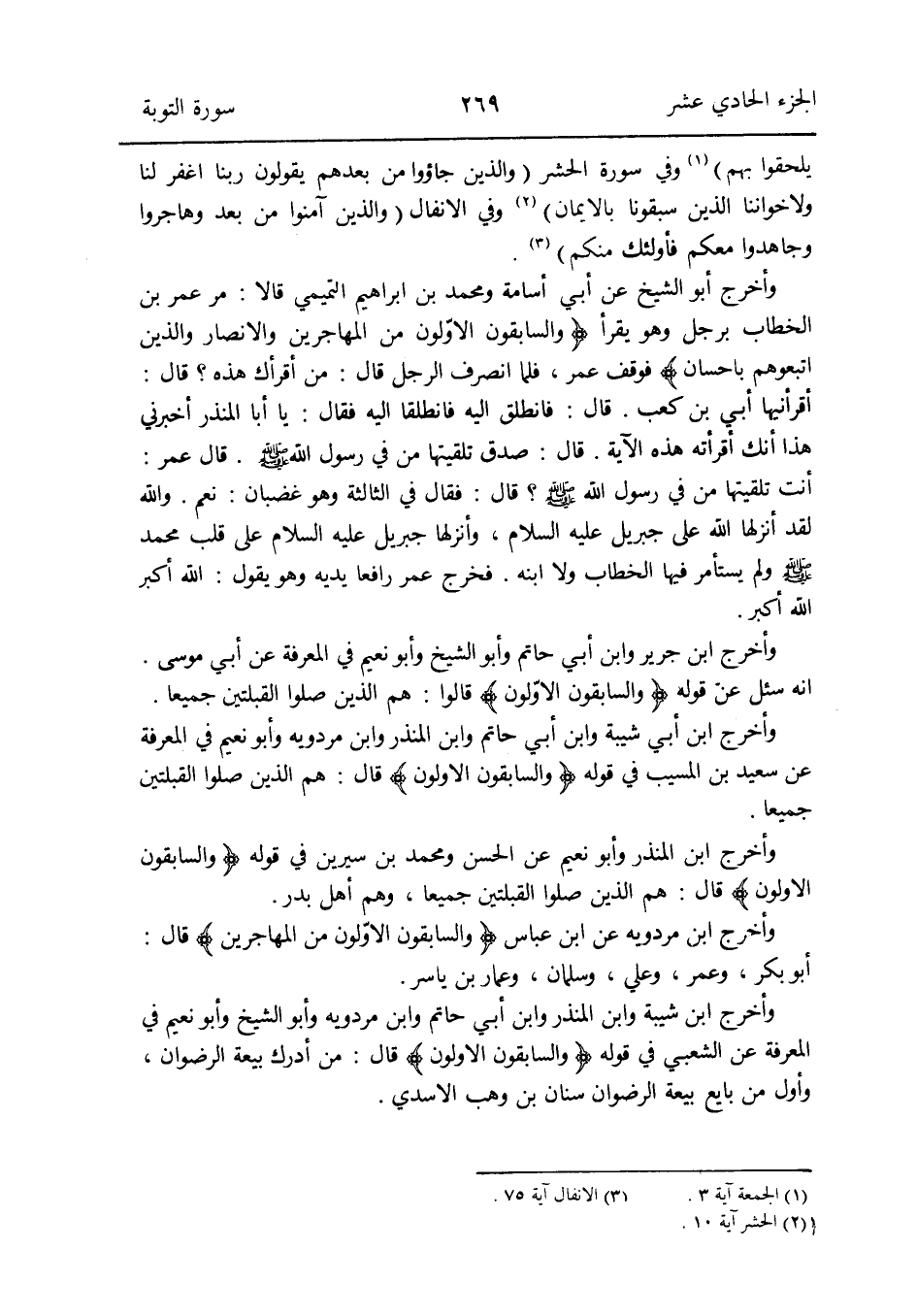 وَأخرج أَبُو الشَّيْخ عَن أبي أُسَامَة وَمُحَمّد بن إِبْرَاهِيم التَّمِيمِي قَالَا: مر عمر بن الْخطاب بِرَجُل وَهُوَ يقْرَأ {وَالسَّابِقُونَ الأوّلون من الْمُهَاجِرين وَالْأَنْصَار وَالَّذين اتَّبَعُوهُمْ بِإِحْسَان} فَوقف عمر فَلَمَّا انْصَرف الرجل قَالَ: من أَقْرَأَك هَذِه قَالَ: أَقْرَأَنيهَا أبي بن كَعْب