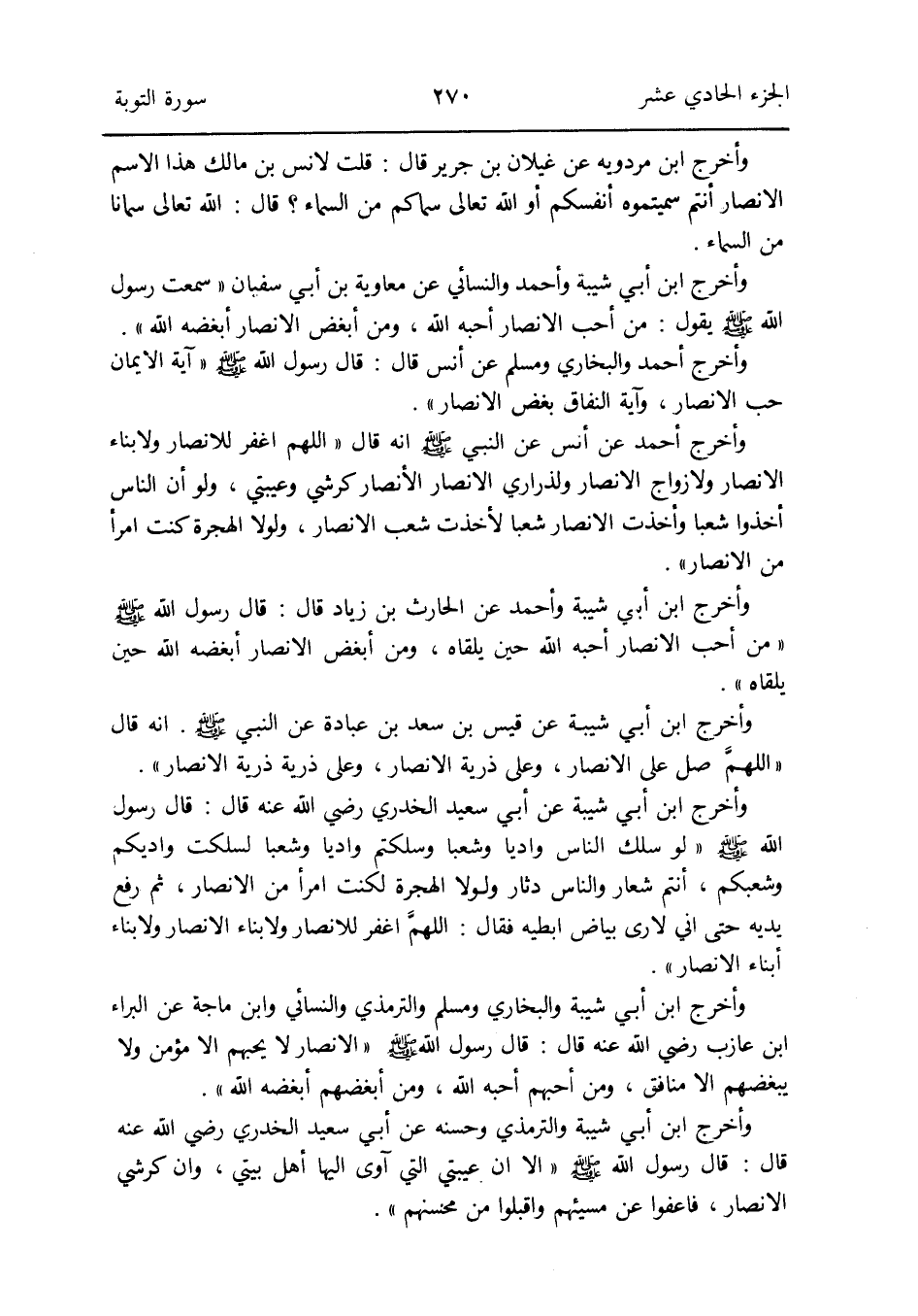 وَأخرج ابْن أبي شيبَة وَالْبُخَارِيّ وَمُسلم وَالتِّرْمِذِيّ وَالنَّسَائِيّ وَابْن ماجة عَن الْبَراء بن عَازِب رَضِي الله عَنهُ قَالَ: قَالَ رَسُول الله صلى الله عَلَيْهِ وَسلم الْأَنْصَار لَا يُحِبهُمْ إِلَّا مُؤمن وَلَا يبغضهم إِلَّا مُنَافِق وَمن أحبهم أحبه الله وَمن أبْغضهُم أبغضه الله