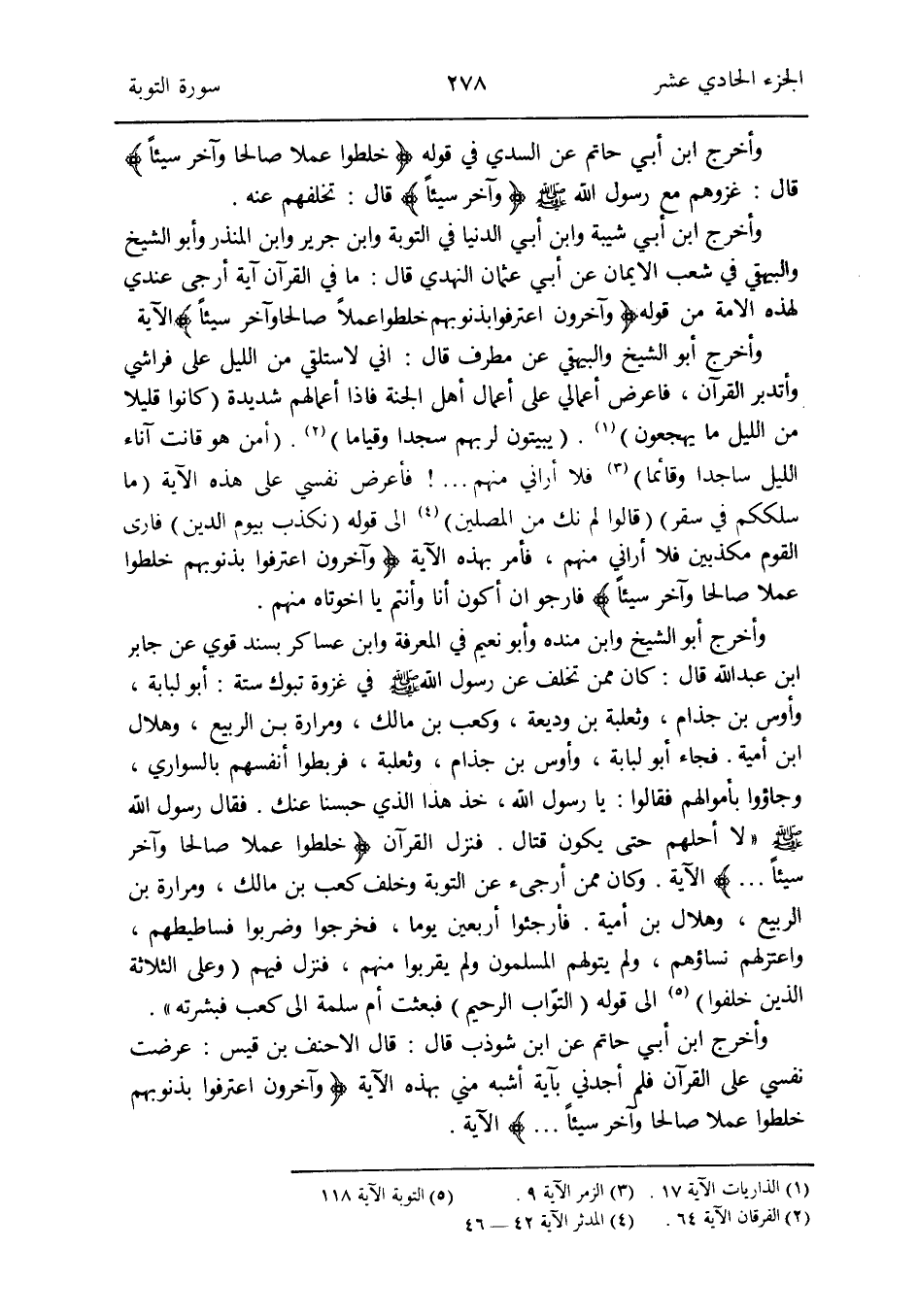 وَأخرج أَبُو الشَّيْخ وَالْبَيْهَقِيّ عَن مطرف قَالَ: إِنِّي لاستلقي من اللَّيْل على فِرَاشِي وأتدبر الْقُرْآن فَأَعْرض أعمالي على أَعمال أهل الْجنَّة فَإِذا أَعْمَالهم شَدِيدَة (كَانُوا قَلِيلا من اللَّيْل مَا يهجعون) (الذاريات الْآيَة 17)
