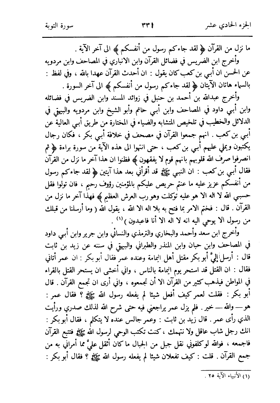 وَأخرج ابْن سعد وَأحمد وَالْبُخَارِيّ وَالتِّرْمِذِيّ وَالنَّسَائِيّ وَابْن جرير وَابْن أبي دَاوُد فِي الْمَصَاحِف وَابْن حبَان وَابْن الْمُنْذر وَالطَّبَرَانِيّ وَالْبَيْهَقِيّ فِي سنَنه عَن زيد بن ثَابت قَالَ: أرسل إليَّ أَبُو بكر مقتل أهل الْيَمَامَة وَعِنْده عمر فَقَالَ أَبُو بكر: إِن عمر أَتَانِي فَقَالَ: إِن الْقَتْل قد استحر يَوْم الْيَمَامَة بِالنَّاسِ واني أخْشَى أَن يستحر الْقَتْل بالقراء فِي المواطن فَيذْهب كثير من الْقُرْآن الا أَن تجمعوه وَإِنِّي أرى أَن تجمع الْقُرْآن